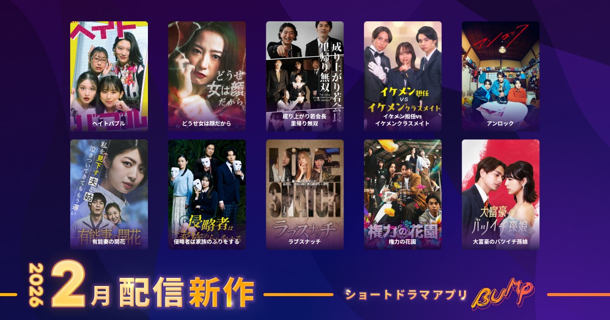 【ショートドラマアプリ「BUMP」】2026年2月公開の新作ショートドラマ作品ラインナップ。逆襲劇や痛快リベンジ・下剋上など、刺激と共感が交錯する10本を公開!