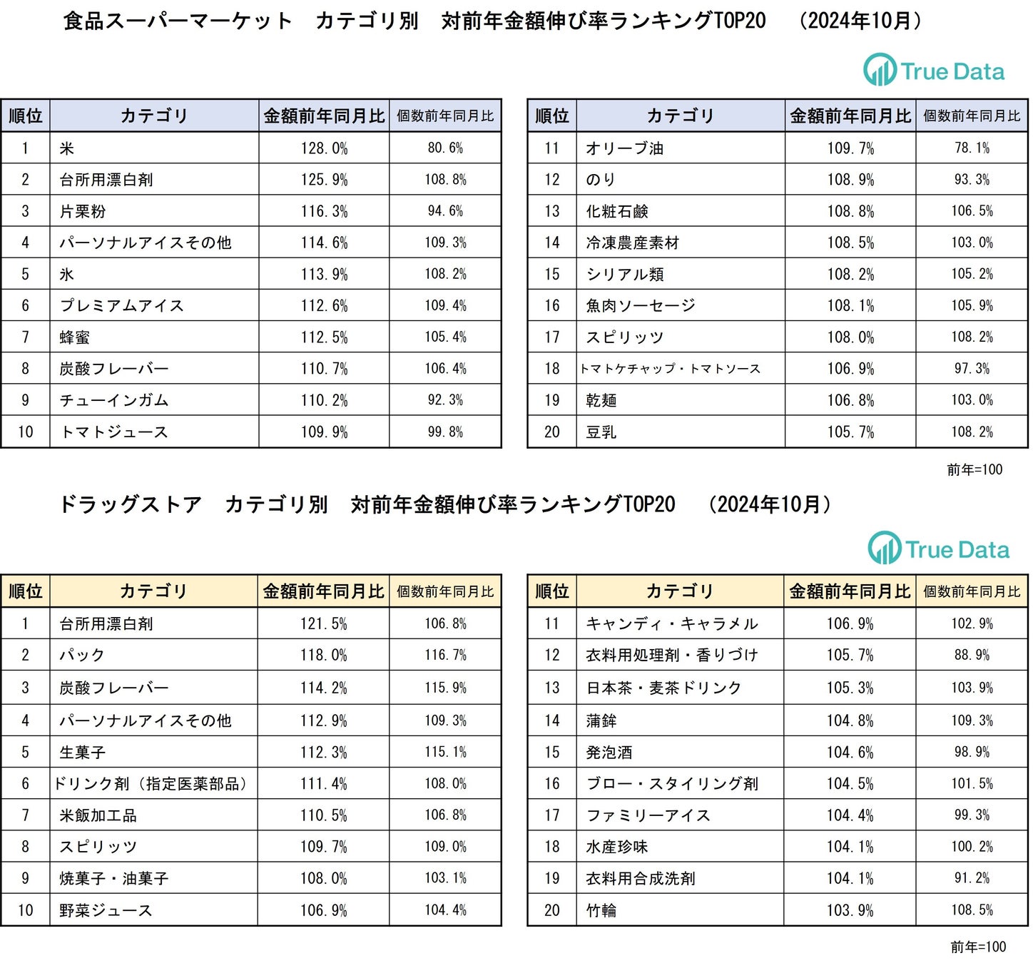 ビッグデータプラットフォームを運営する株式会社True Data(トゥルーデータ/本社:東京都港区、代表取締役社長:米倉 裕之、証券コード4416)は、当社の統計データをもとに、ドラッグストア、食品スーパーマーケットにおける2024年10月の売り上げ伸長カテゴリを発表します。食品スーパーマーケットで前年同月と比べ最も売り上げを伸ばしたのは「米」でしたが、売上個数をみると2割減少しています。「米」の平均売価は新米が店舗に並んだ後も上昇が続いています。そのほかのカテゴリでは、記録的な残暑の影響により、アイス類、氷などの夏物商材が売り上げを伸ばしました。