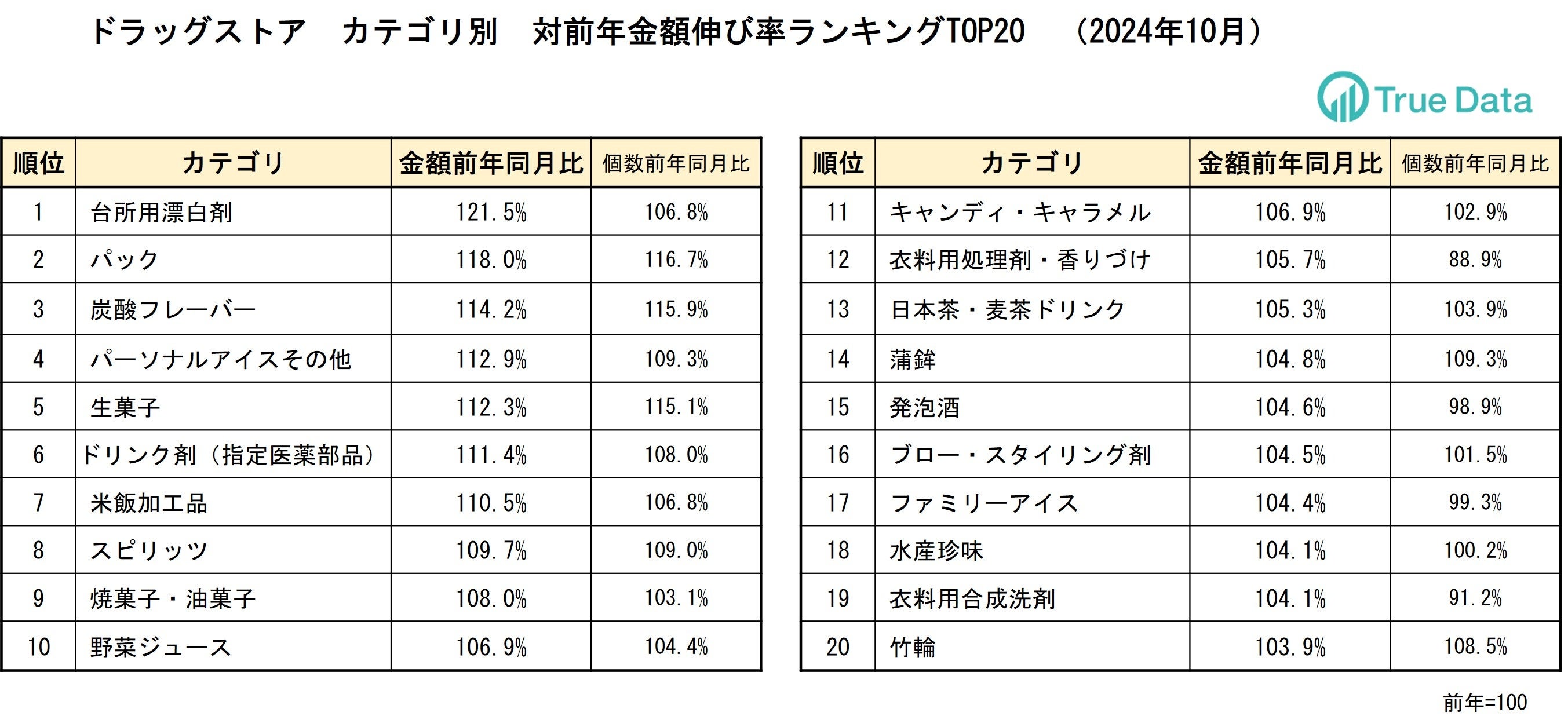 ドラッグストア、食品スーパーマーケット 対前年伸び率TOP20カテゴリを発表【 2024年10月 】