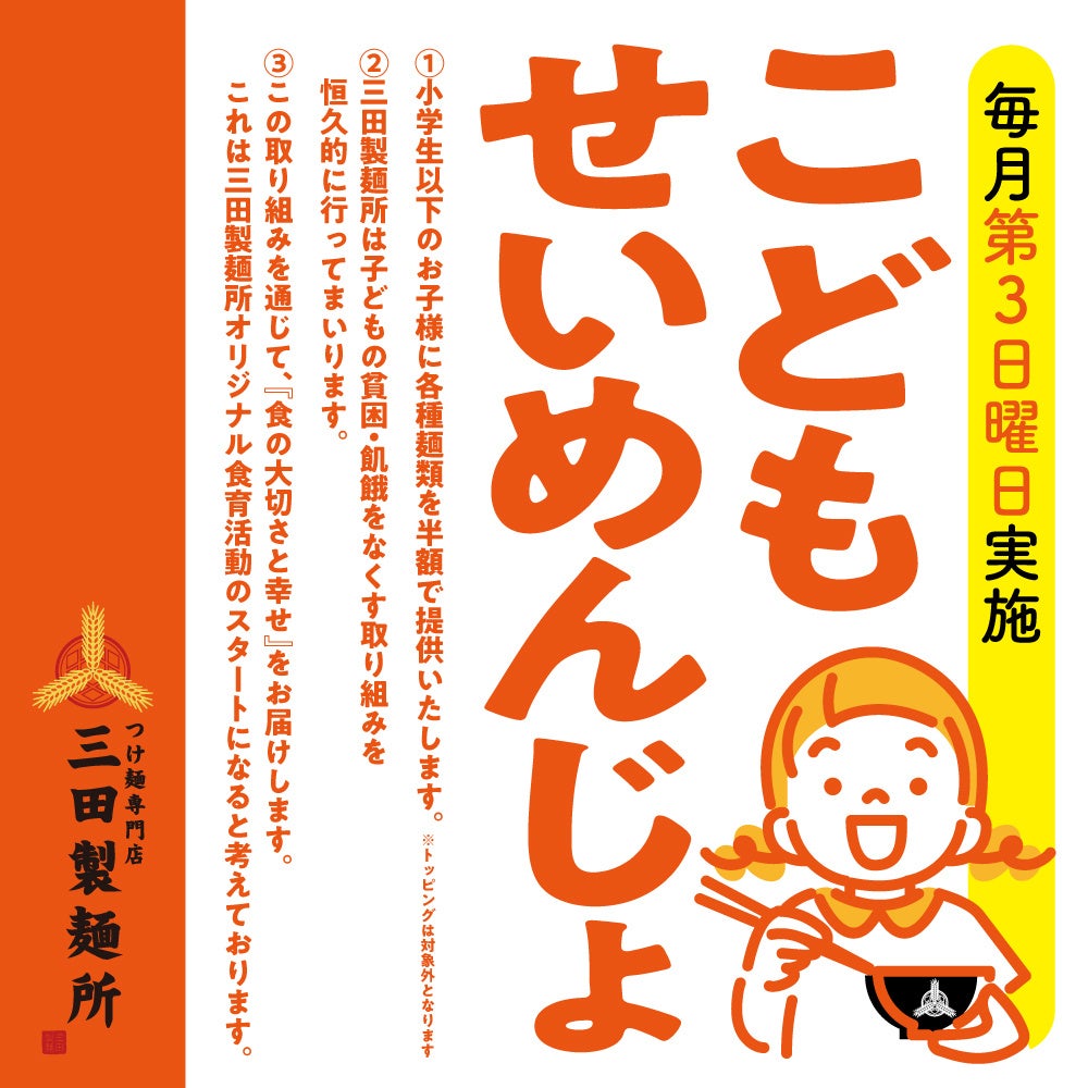 2024年1月より第3日曜日を 『#子どもせいめんじょ』の日とし、小学生以下のお子様へ、麺類各メニューを半額にて提供しております。