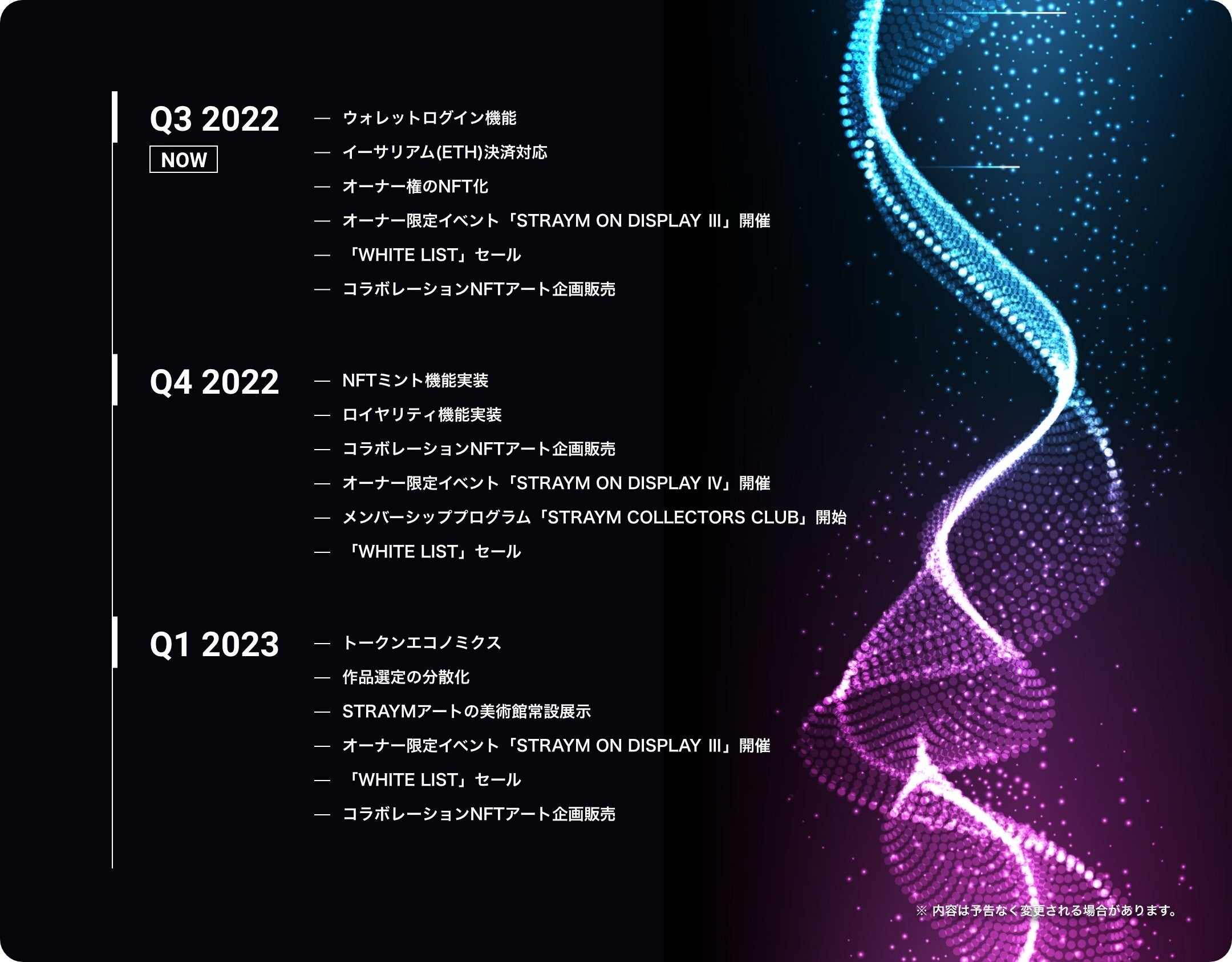 実社会とWEB3を繋ぐ架け橋として、パートナーが持っている価値を多角的視点から戦略的にアップデートさせたプロジェクトを組み立てます。またプラットフォーム「STRAYM(ストレイム)」を活用してマーケティングを行い、独自に構築したブロックチェーンプロトコルを更に洗練させていくことでユーザーの利便性を追求していく、日本を軸にしたボーダレスに展開していく次世代型クリエイティブエージェンシーです。