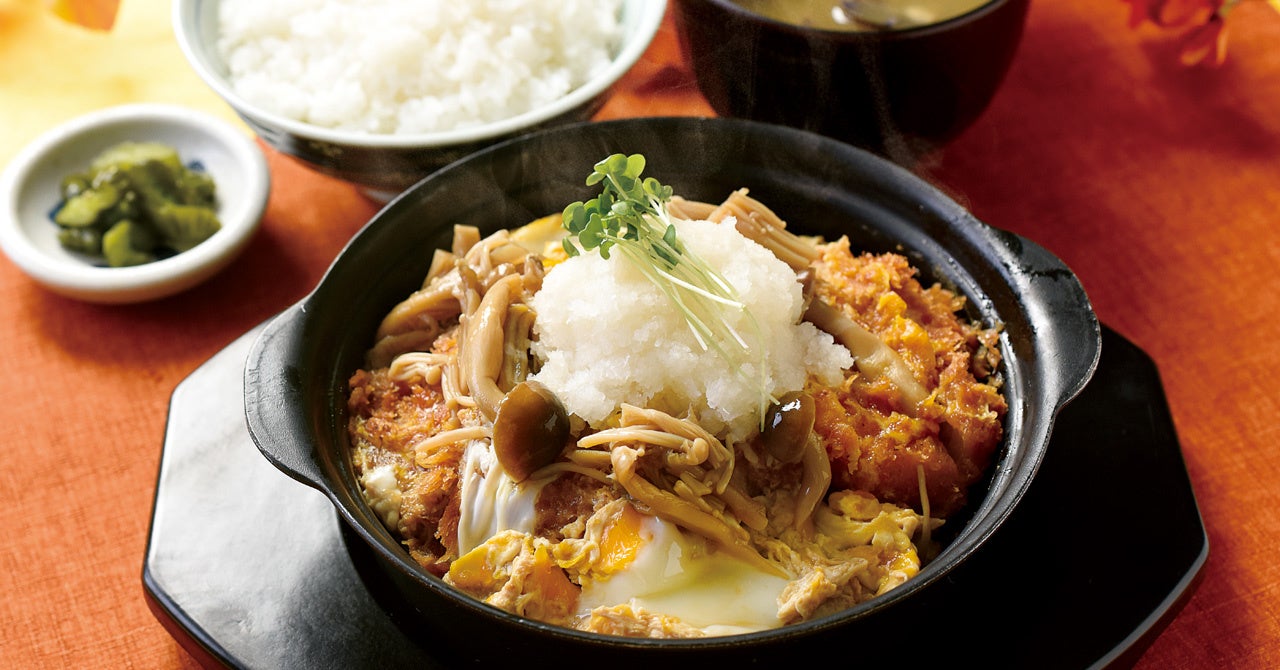 | きのこおろしロースカツ煮御膳 漬物・しじみ汁・キャベツ付 1,454円(税込 1,600円) えのき、舞茸、しめじをロースカツと一緒に煮込み、たまごでとじました。大根おろし添えで、さっぱりとお召し上がりいただけます。 |
