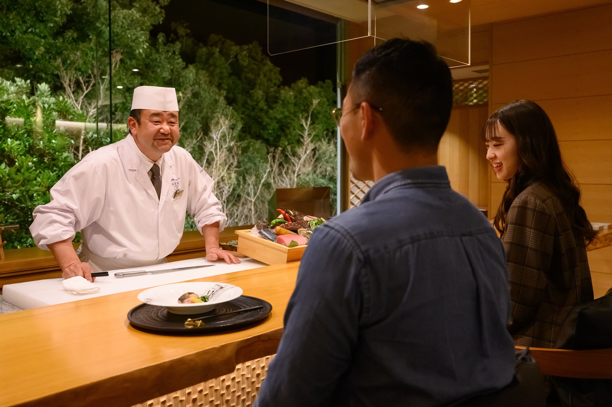 「森に浮かぶレストラン」をテーマに、木漏れ日を感じさせる心地よい空間を楽しめる和食レストラン里海には、料理人が目の前で調理し、できたてをその場で提供する4名様限定の特別席「割烹カウンター」がございます。