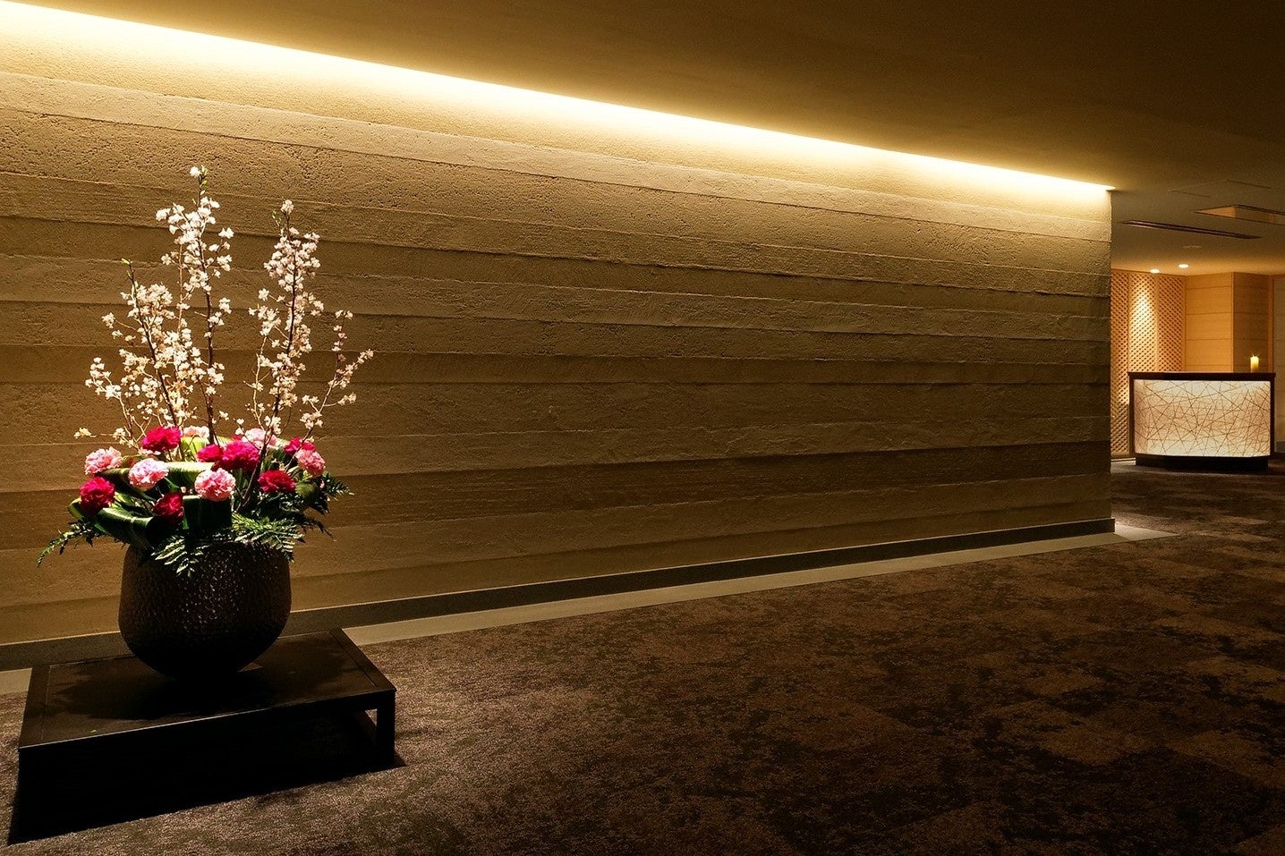 さらに、レストラン内のパーテーションは、細くひき割った木に溝・穴・ホゾ加工を施しカンナやノコギリ、ノミ等で調節しながら1本1本組付けしていく遠く飛鳥時代から長い年月をかけて磨きぬかれた木工技術「組子」が施され、麻の葉や清海波などの4種類の組子模様もお楽しみいただけます。