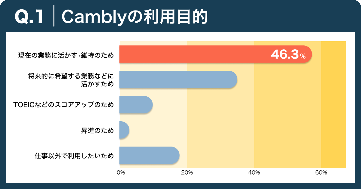 Cambly法人プランをご利用いただいているビジネスパーソンを対象にアンケートを実施した結果、多くの回答者が業務に活かせる英会話力を身につけることを目的としてオンライン英会話をご利用いただいていることが確認できました。