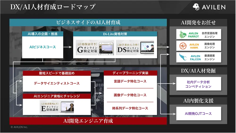 AVILENは引き続き、AI・データサイエンス活用の戦略立案から、ディープラーニング等の機械学習関連アルゴリズムの開発及びその内製化、そしてAI・データサイエンス人材の育成まで、一気通貫でお客様をご支援します。