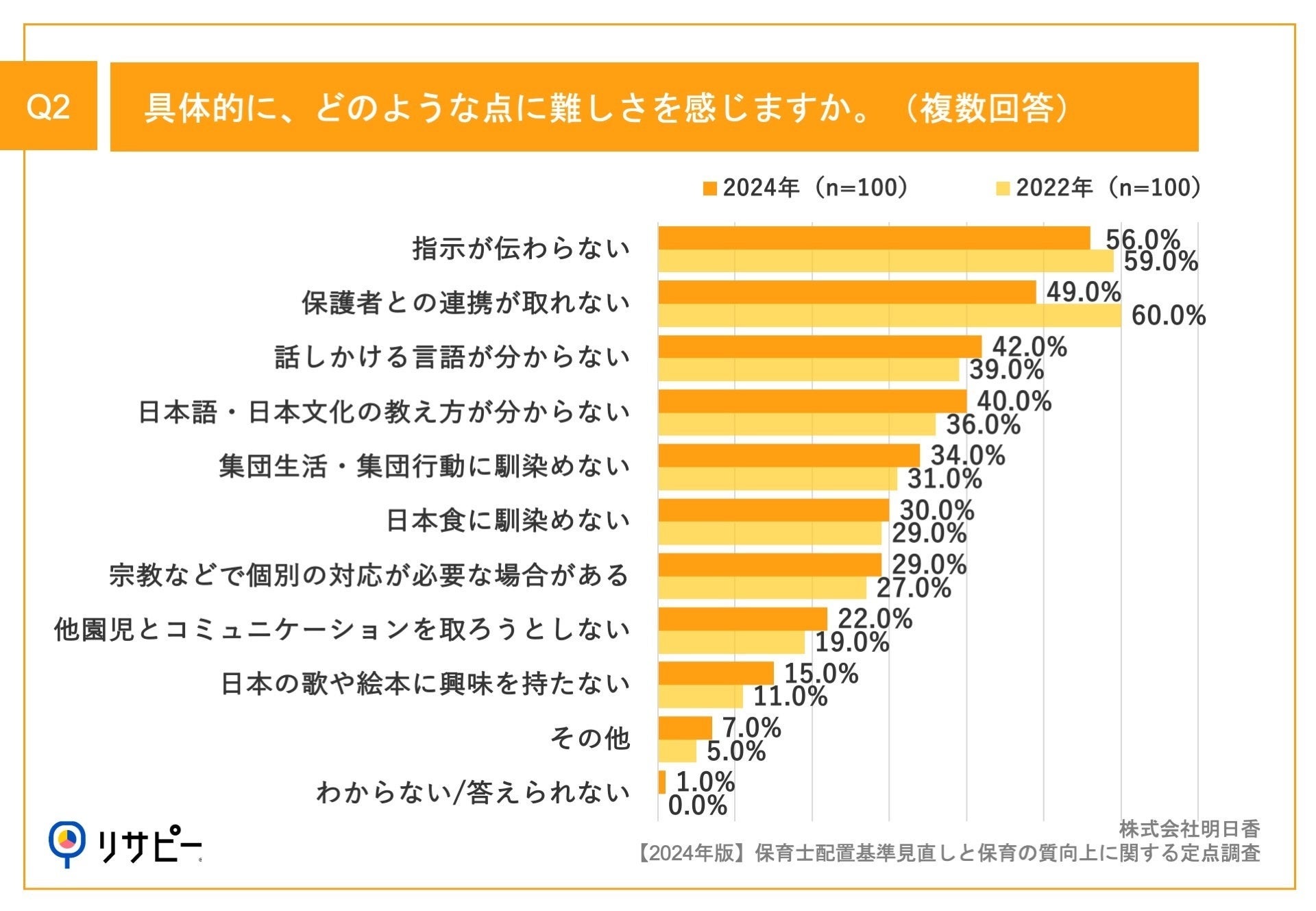 当社が、外国籍園児を保育した経験がある保育士104名を対象に実施した調査(※4)でも、外国籍園児の保育に関して、96.1%の保育士が、「難しさを感じたことがある」と回答しており、具体的には「指示が伝わらない」(56.0%)、「保護者との連携が取れない」(49.0%)、「話しかける言語が分からない」(42.0%)などが挙げられています。