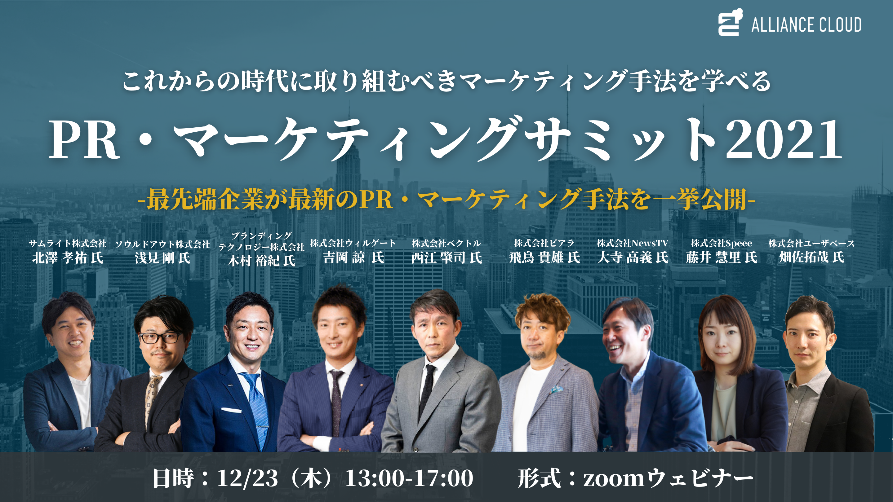 本サミットは株式会社アライアンスクラウドが主催となり、「PR・マーケティングサミット2021 -最先端企業が最新のPR・マーケティング手法を一挙公開-」と題して、最新のPR・マーケティング手法に取り組む最先端企業が登壇するサミットです。