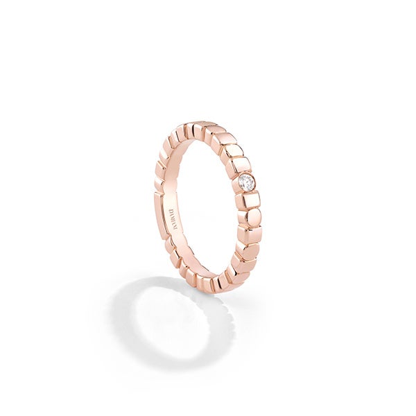 コレクションは映画フィルムのリールから着想を得てデザインされています。回り出したリールは永遠に止まることなく互いを追い続けます。これと同じ動きがダミアーニのジュエリーにも取り入れられ、円と長方形が交互に配置されて複層的な形状をなし、ダイナミックな躍動感を生み出しています。映画が持つ、変化し続けるイメージを再現する力は、ダミアーニが創作に込めようとする生命力と芸術的創造力を象徴しています。