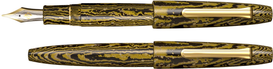 幾層にも重ねたエボナイト材と複雑に織りなす色が美しい 『長刀研ぎエボナイト万年筆 猛虎』