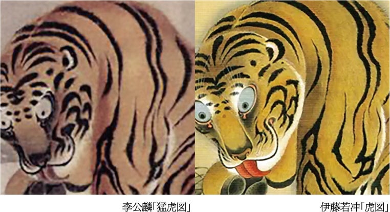 色鮮やかでリアルな花や鳥などを描いた花鳥画で知られる画家、伊藤若冲。絵画と禅に傾倒し、40歳で家業を弟に譲って画業に専念しました。最初に学んだ狩野派では飽き足らず、元・明の古画と光琳派という和漢の装飾画を研究・模写するかたわら、動植物の写生に努め、特に鶏の絵を得意としました。今回の「虎図」は元・明の古画である李公麟の「猛虎図」の模写をしたものになります。原作は、黄土色の絵の具で虎の毛を一本ずつ丁寧に描いていますが、「虎図」は黄土色で下塗りをした上から、墨で細かい線を描き加え、黄と黒のコントラストを原作よりはっきりとさせています。また輪郭には墨を入れることで虎を浮かび上がらせています。模倣でありながらも原作にはない特徴があります。