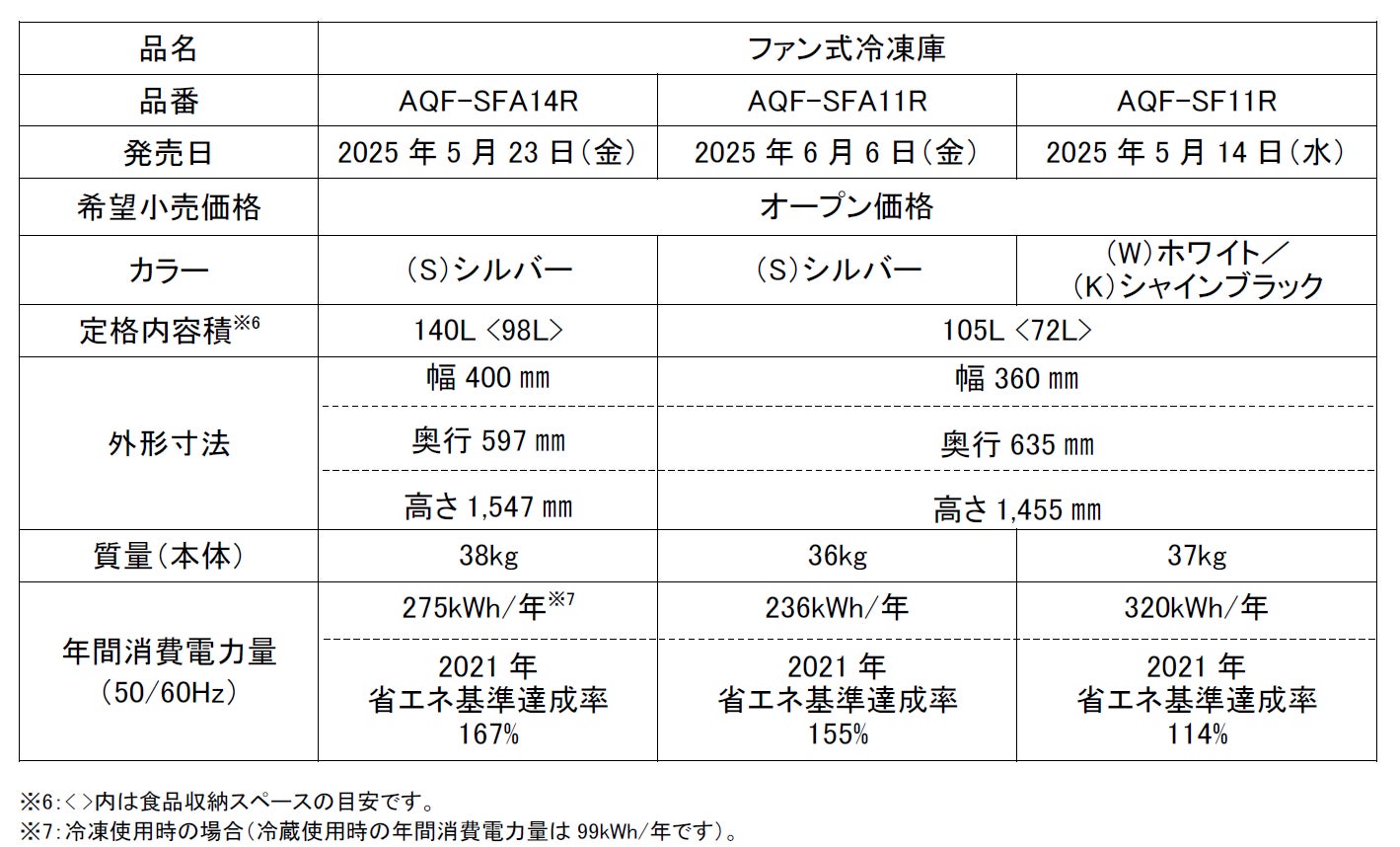 アクア株式会社(本社:東京都中央区、代表取締役社長 兼 CEO:杜 鏡国)は、横幅がスリムでキッチンやリビングのすき間に置きやすい「スリムフリーザー」シリーズの2025年モデル「AQF-SFA14R」「AQF-SFA11R」「AQF-SF11R」を、2025年5月14日(水)より順次発売します。「AQF-SFA14R」「AQF-SFA11R」は従来モデル(※1)から省エネ性能を強化(※2)(※3)し、さらにエコになりました。食品の値上げラッシュで家庭での節約意識が高まる中、当社は家計や快適な食生活への貢献を目指し、今後も冷凍庫の性能アップを図るとともに、さまざまな世帯に寄り添った幅広いラインナップを展開してまいります。