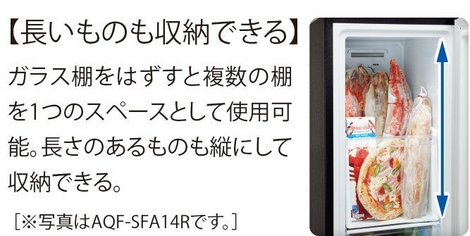 「AQF-SFA14R」は容量140L・横幅40cm、「AQF-SFA11R」と「AQF-SF11R」は容量105L・横幅36cm。いずれも自動霜取り機能が付いていて、背面の壁ピタ設置も可能です。さらに、整理しやすく取り出しやすい4つの引き出し&ガラス棚付き。ガラス棚をはずせば複数の棚を1つのスペースとしてお使いいただけるので、カニの足やフランスパンなど、長いものの収納も可能です。