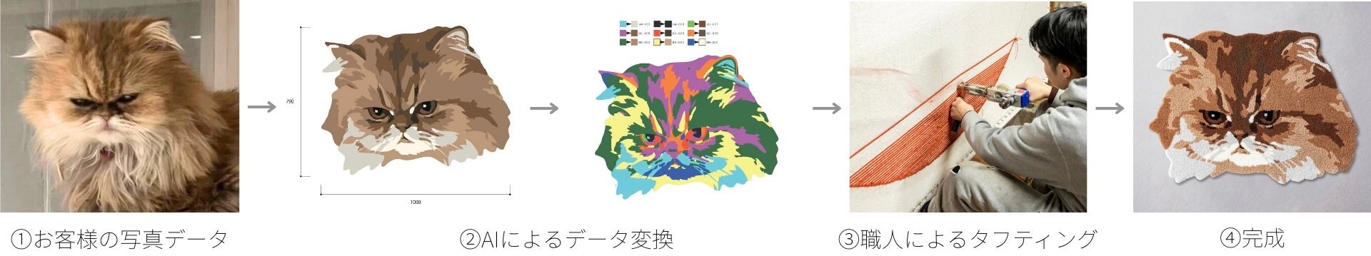 オーダーラグは、写真から猫の輪郭や表情の特徴をAIで読み取り、徳島の職人による手仕事へとつなぐことで、一枚一枚異なる、アート性を備えた一枚に仕上げました。