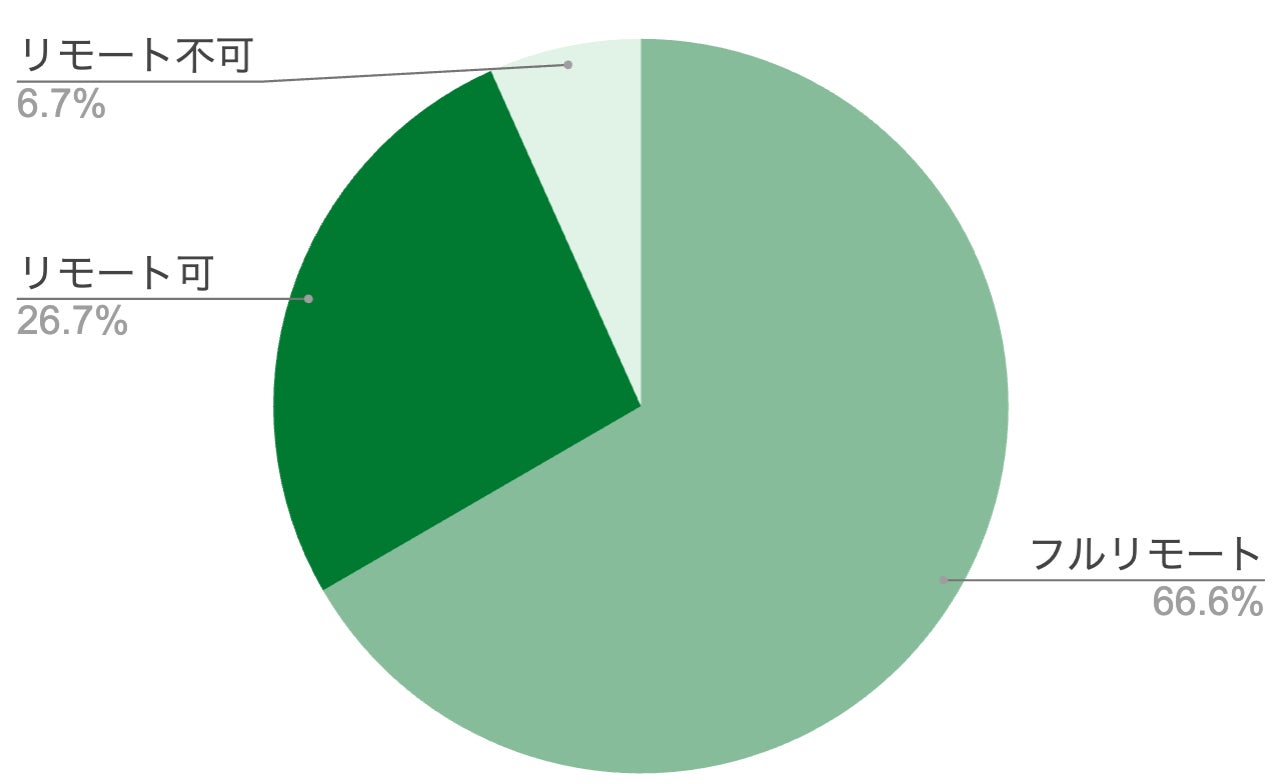 PHPエンジニアの働き方において、リモートワークが広く受け入れられていることが明らかです。データによると、フルリモート(完全在宅)が可能な案件が66.7%を占め、3分の2以上の案件で柔軟な勤務形態が提供されています。