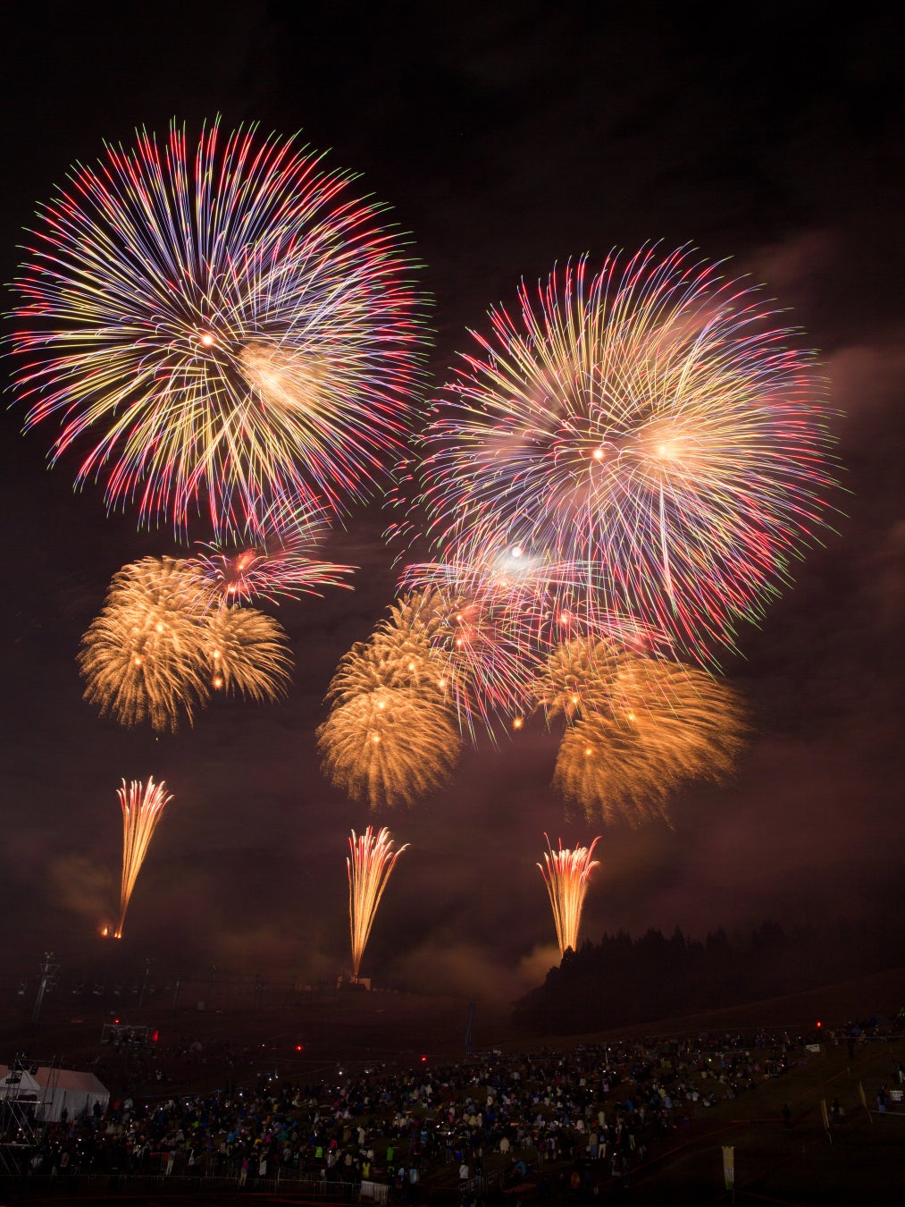続くプログラムは『オープニング スターマイン THE 長岡花火』とスターマイン『東山に咲く華』。会場である東山映える変色花火をふんだんに使ったプログラムだ。そして、長岡花火の代名詞とも言える『復興祈願花火 フェニックス』。夏とはひと味違うフェニックス花火米フェスバージョンに、会場から歓声が上がりました。