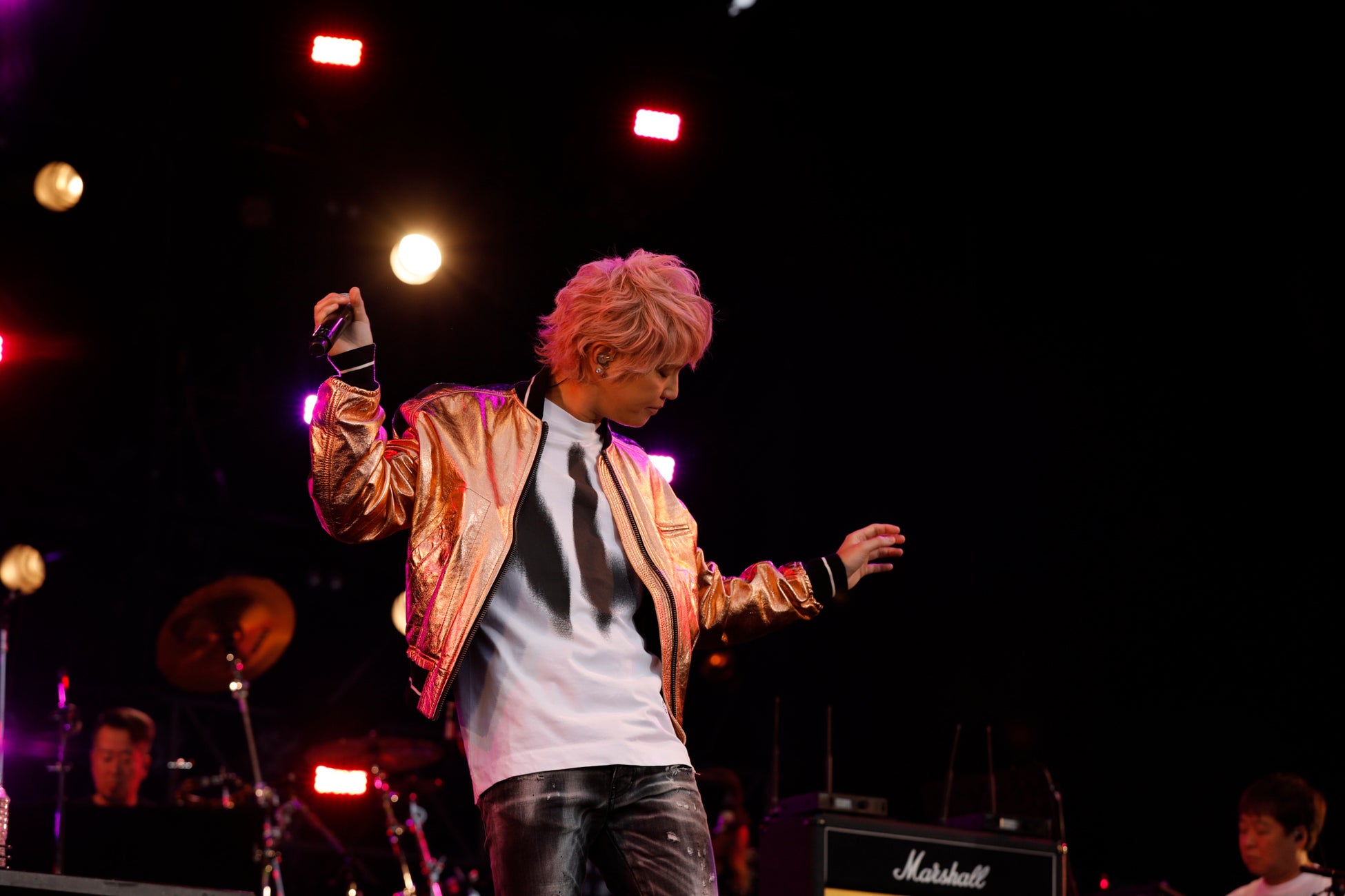 1曲目は昨年末にリリースした「モガケ!」。倒れそうになっても、ひるむことなく前に進もうというメッセージが込められた曲。2曲目「Hello!」は陽気でポジティブなナンバー。3曲目「Venus Symphony」の後のMCでは、ファンサービスも忘れません。4曲目「シナモン」、5曲目「MAZE WORLD」と観客を手越ワールドに引き込み、6曲目「ウインク」へと続く、ギタリスト、マーティ・フリードマンとのコラボで、アイドル時代とは違うソロアーティストとしての魅力にあふれるステージ。