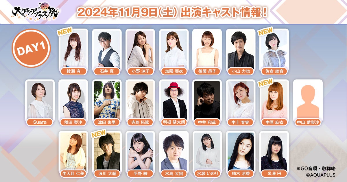 株式会社アクアプラス(以下アクアプラス)は、本日配信した特別番組「新情報続々!? 『大アクアプラス祭』&『ToHeart2×ロスフラ』コラボ スペシャル生放送!」において、「大アクアプラス祭 -30th Anniversary-」(主催:株式会社アクアプラス/株式会社HIKE、以下大アクアプラス祭)に浪川大輔さん、佐倉綾音さん、中原麻衣さん、綾瀬有さん、市ノ瀬加那さん、羊宮妃那さん、関根瞳さん、YURiKAさんが追加出演することを発表しました。あわせて、大アクアプラス祭のMCは浪川さん、アシスタントMCが利根健太朗さんに決定したこともお知らせいたします。大アクアプラス祭のチケットプレイガイド一次先行は8月1日(木)18時より受付をスタートします。