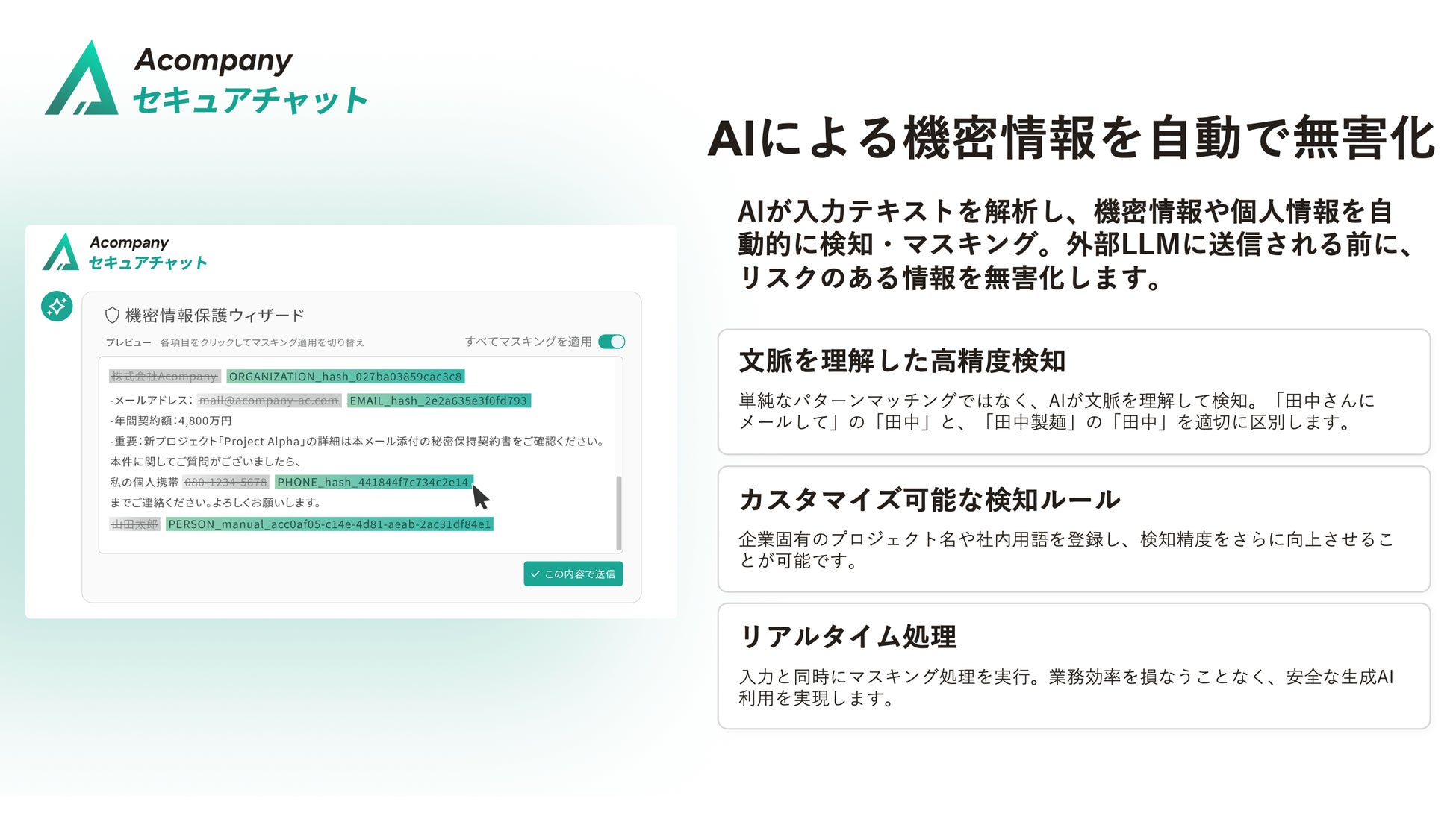 AIが入力テキストを解析し、機密情報や個人情報を自動的に検知・マスキングします。外部LLMに送信される前に、リスクのある情報を無害化します。
