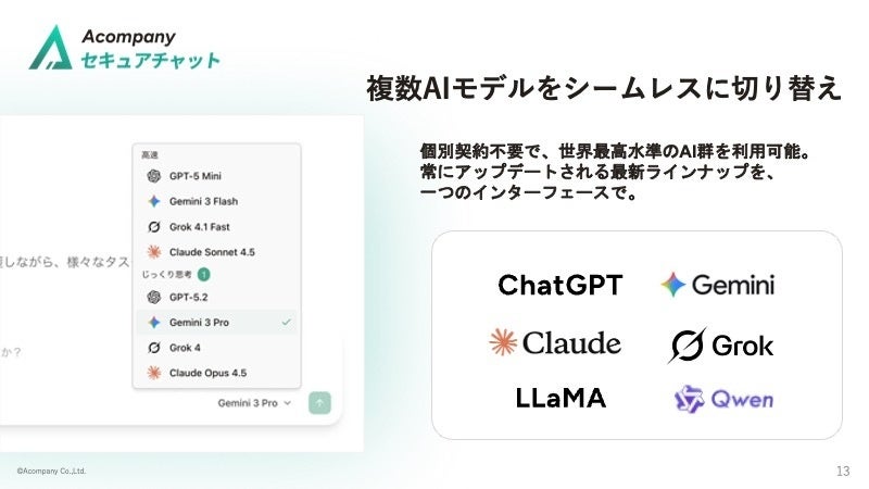 第一弾製品として、「生成AIへの機密データ入力禁止」問題を解決し、複数の最新AIモデルを安全に利用できる『Acompany セキュアチャット』の提供を開始します。