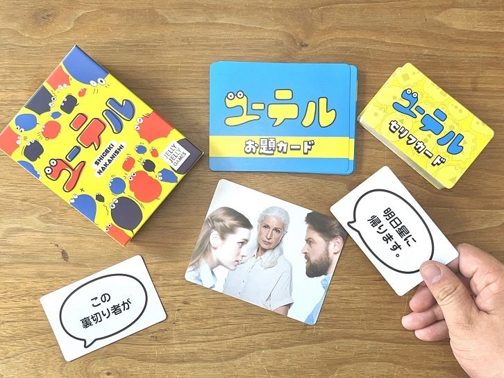 元々オリジナルゲームを100以上作っており、NTV「ウチのガヤがすみません」「ガキの使いやあらへんで」TBS「王様のブランチ」等でも紹介された実績をもつなすなかにし渾身のゲーム『ユーテル』。遊び方はいたって簡単。写真やイラストのお題カードに対して、手持ちのセリフカードからお題に合った1枚を選んで発表し、一番面白かった人を決めます。