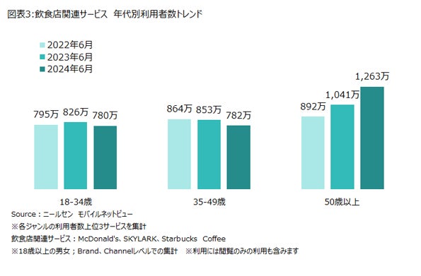 最後に、利用者数の多い「飲食店関連サービス」の年代別利用者数トレンドを見ると、50歳以上の利用が最も多くなっていました。18-34歳、35-49歳ではそれぞれ約780万人が利用しているのに対し、50歳以上では1,263万人が利用していることがわかります。また、2年前の同時期と比べると、50歳以上の利用者数は42%増加し、全体の利用者数増加を牽引していることがわかります(図表3)。