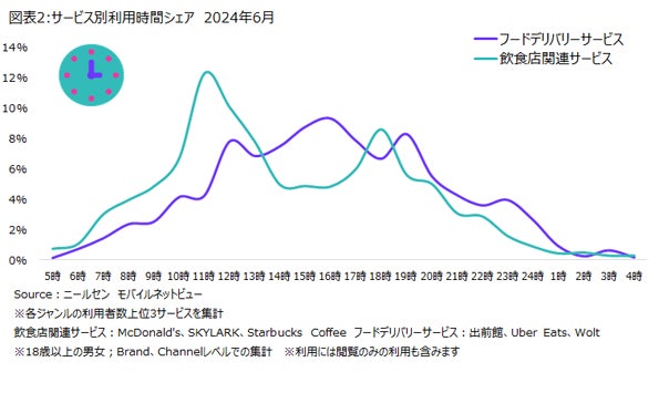 次に、各サービス別の利用時間シェアを見ると、「フードデリバリーサービス」は16時台に最も利用されているのに対し、「飲食店関連サービス」は11時台の利用が最も多いことがわかりました。また、飲食店関連サービスは朝の時間帯、フードデリバリーサービスは夜の時間帯の利用が多いことから、各サービスの利用者は生活スタイルに合わせて各サービスを使い分けていることが考えられます(図表2)。