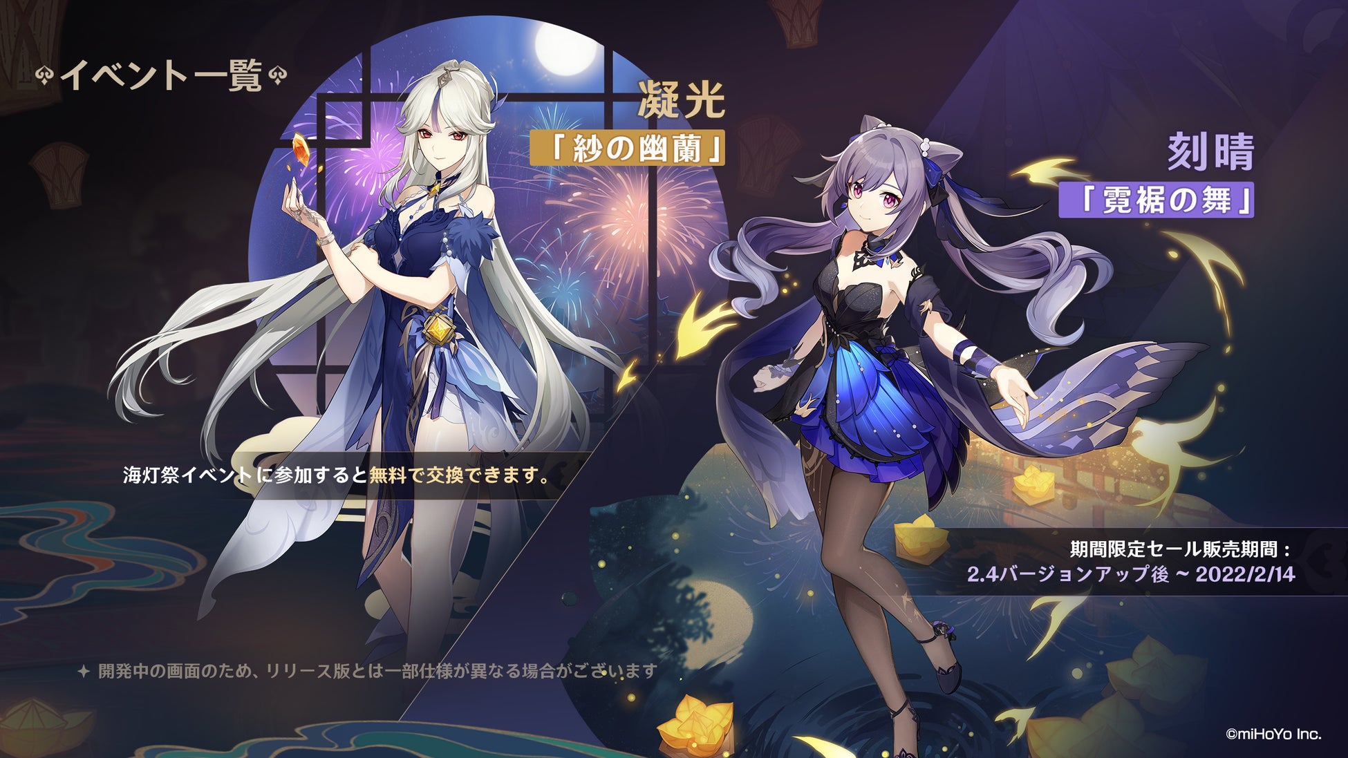 凝光専用コスチューム「紗の幽蘭(しゃのゆうらん)」は、イベント参加で無料で獲得でき、刻晴専用コスチューム「霓裾の舞(げいきょのまい)」は、期間中、限定セール価格で購入することができます。