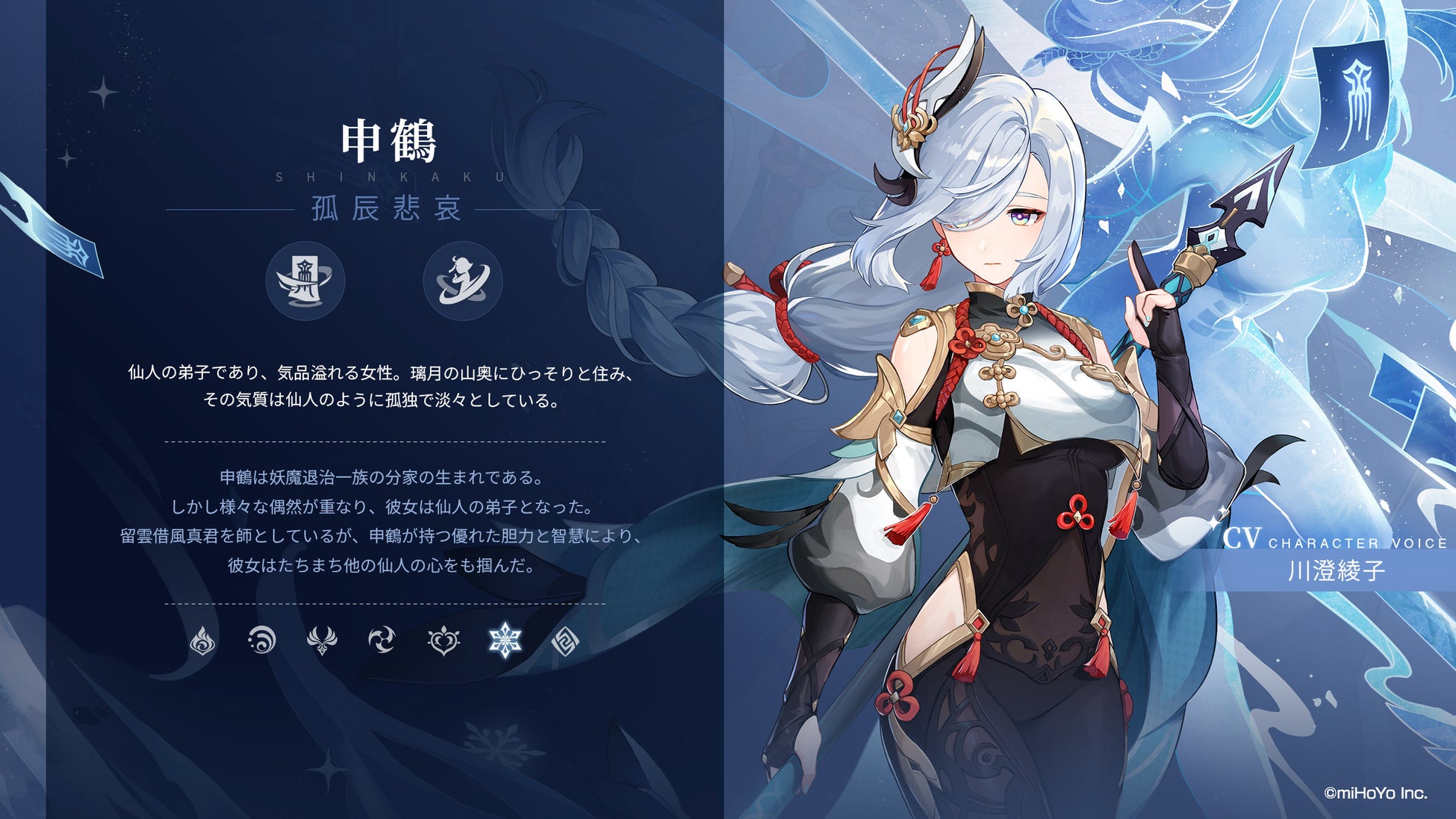 申鶴は氷元素を操り、チームメンバーの氷元素ダメージをアップさせる。また彼女の元素スキルは周囲にいるチームメンバーの元素スキルと元素爆発のダメージや、通常攻撃、重撃、落下攻撃が与えるダメージをアップさせる。
