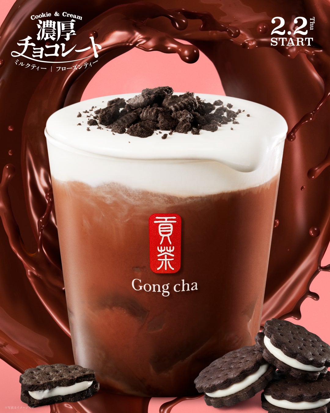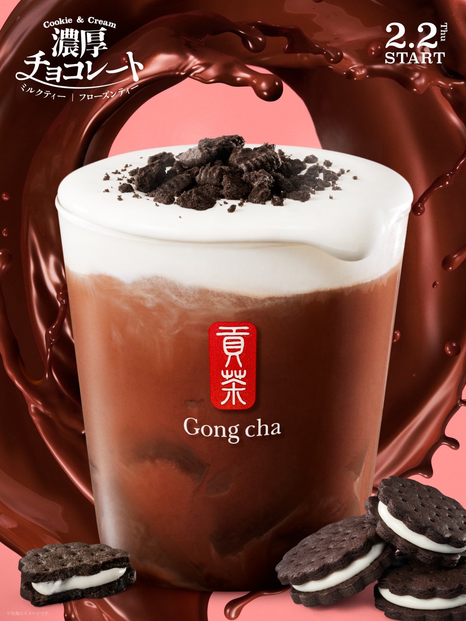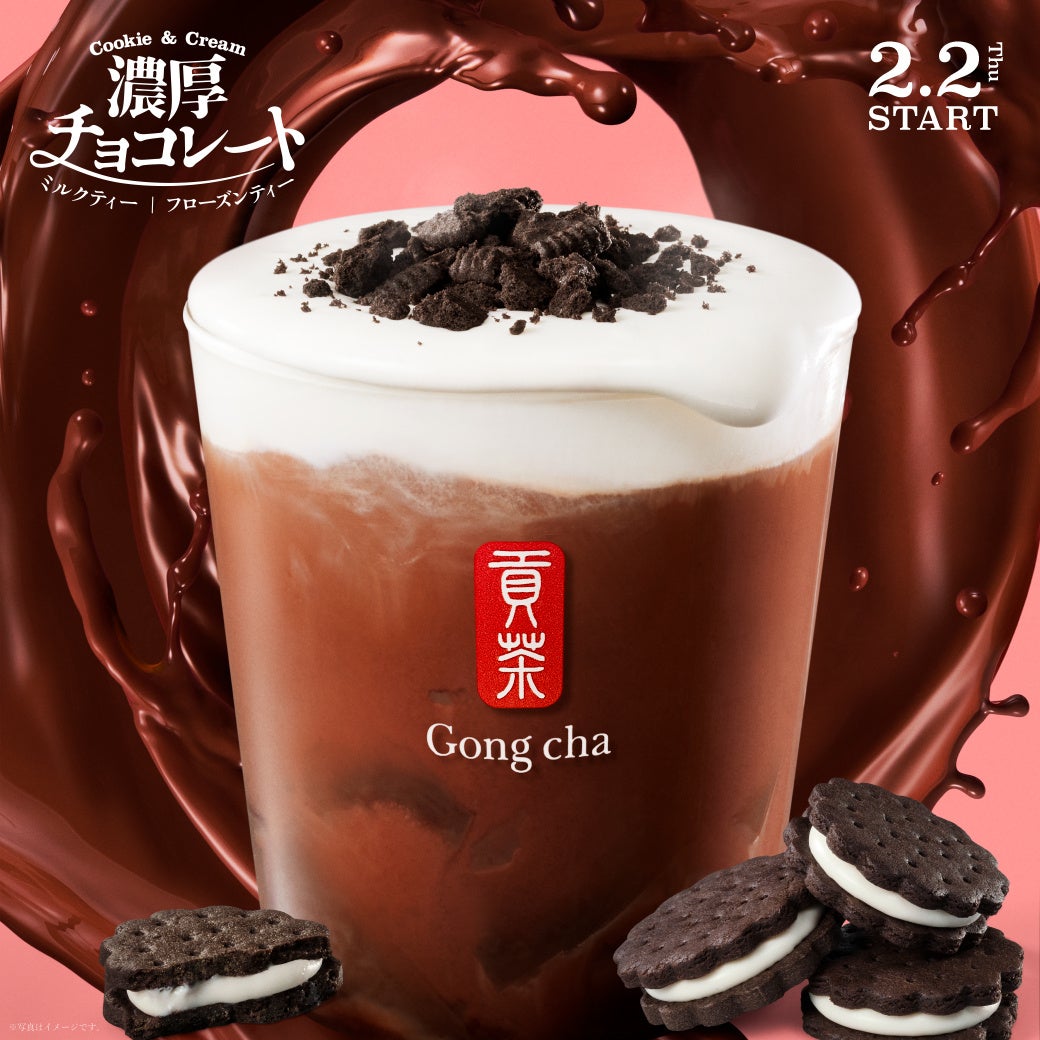バレンタインシーズンにぴったりな、今年の大本命メニューがついに登場!濃厚なチョコレートと、みんなが大好きな定番のクッキー&クリームが出会った、カカオの味わいを贅沢に楽しめるゴンチャ初のデザートティーです。
