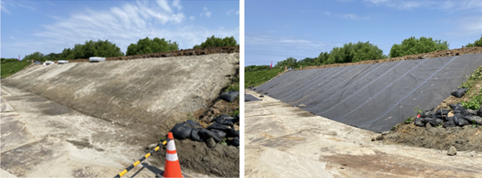 東北地方にて令和6年7月25日から発生した大雨被害により、秋田県由利本荘市において複数の堤防決壊が発生しました。堤防決壊に伴い、堤防裏法(堤防の川から離れた側(宅地や市街地側)の斜面)への被害復旧に対して、護岸工事に経済的で早期復旧が可能な透気防水シート「ブリーザブルシート」が採用されました。