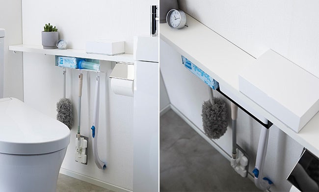 柄の長い物からお掃除シートやトイレ用スタンプなどトイレ用品や掃除アイテムを一括収納。