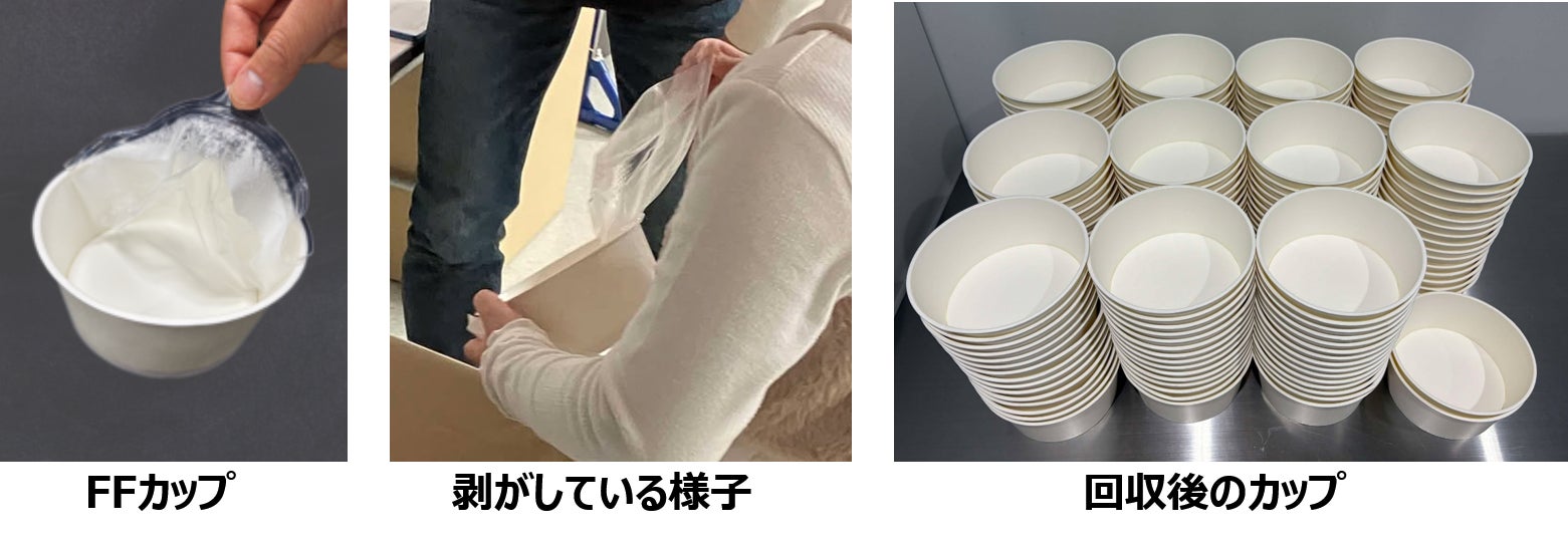2025年2月1日~2日、アルバルク東京対琉球ゴールデンキングス戦が行われた代々木第一体育館にて、FFカップの実証実験を実施しました。480個の提供数に対して171個のカップが回収され、35.6%の回収率となりました。本実証実験により、内側のフィルムを分別することで食品用途の紙カップでもリサイクルが可能な紙資源として利用できることが確認されています。