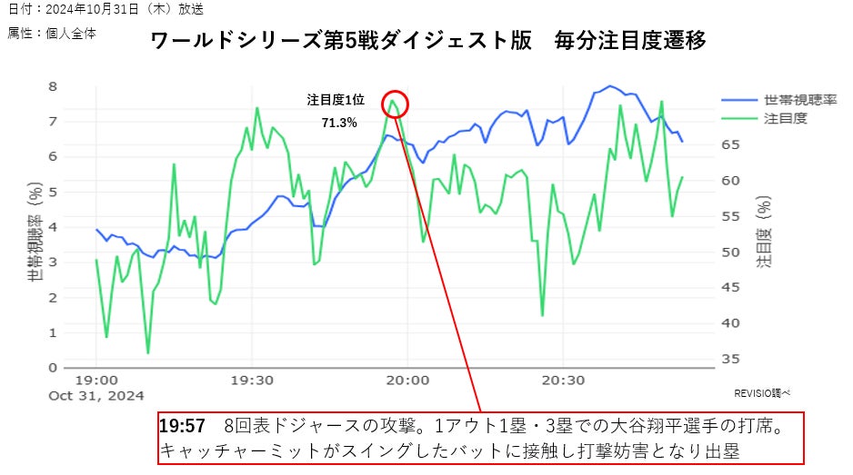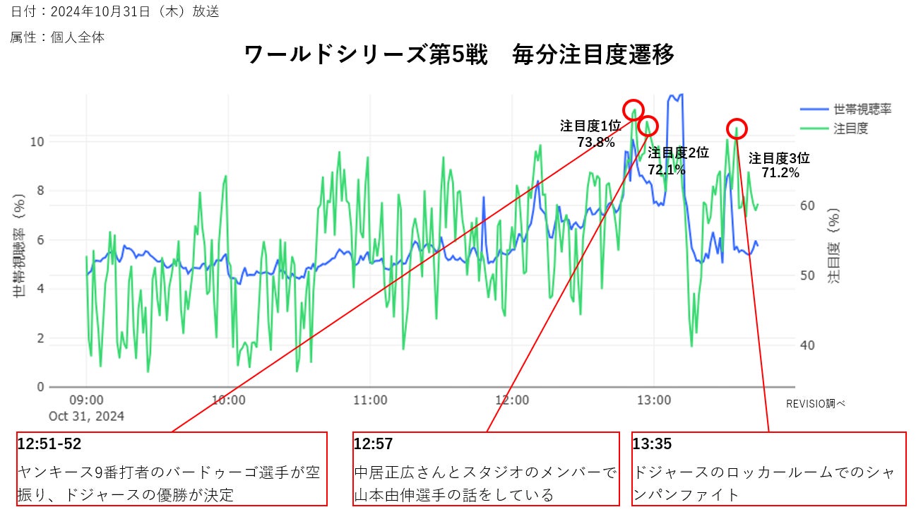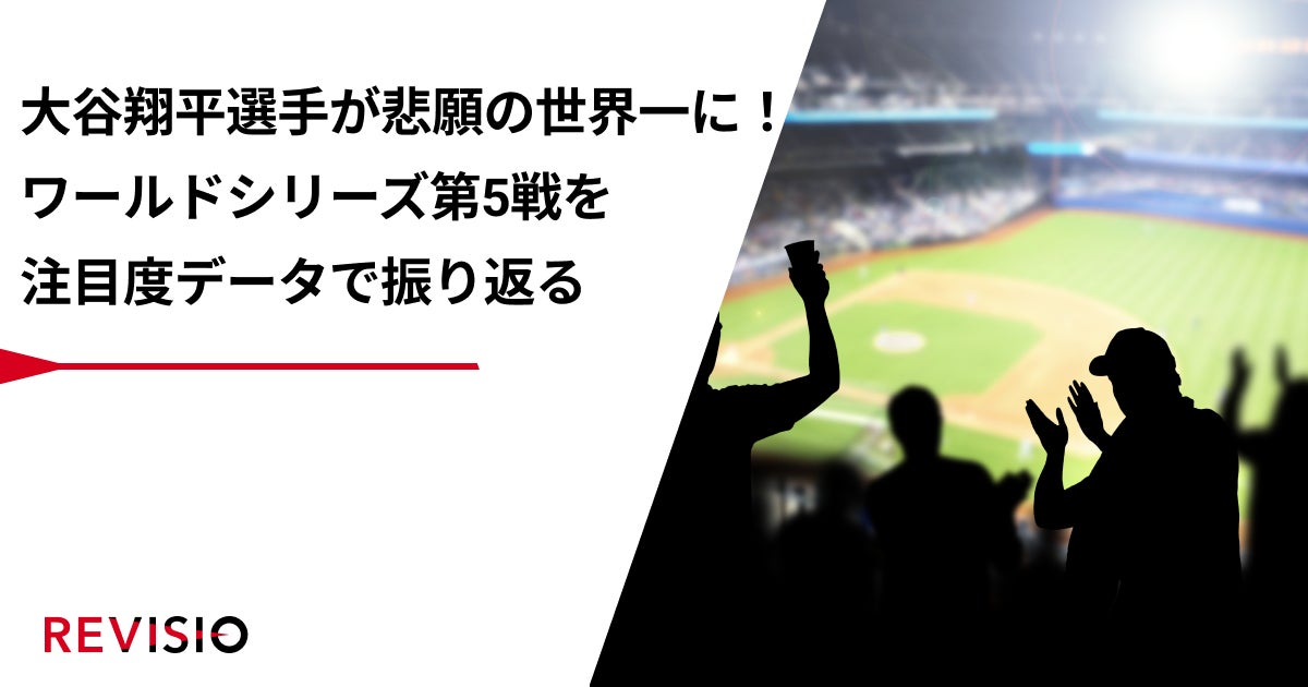 ご家庭に人体認識技術を搭載した機器を設置し、テレビスクリーンへの「注視(アテンション)」を測るREVISIO株式会社(旧TVISION INSIGHTS、本社:東京都千代田区、代表取締役社長 郡谷康士、以下REVISIO)は、10月31日にフジテレビ系列で放送されたMLBワールドシリーズ第5戦「ドジャース対ヤンキース」について、毎分の注目度データを使って視聴者がくぎづけになったシーンを分析いたしました。(「注目度が高い」とは、テレビの前の視聴者が画面にくぎづけになったことを表します)