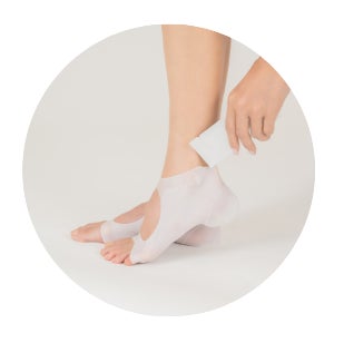 足にピッタリとフィットするシリコンタイプのソックスにジェルを流し込んで、約60分浸して洗い流すだけ!かかとに溜まった分厚い角質をしっかりケア。
