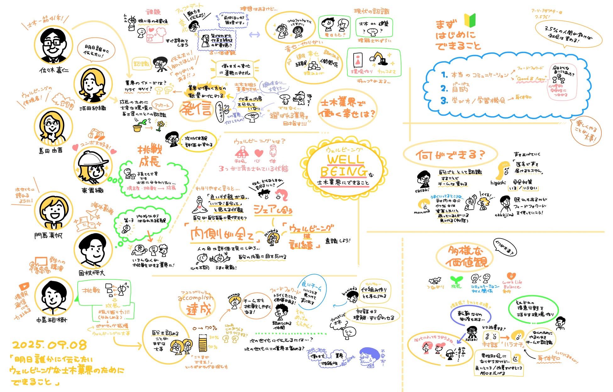 討論会では、土木業界で「働く幸せ」をどう実現するかをテーマに、ウェルビーイングの本質やその高め方について活発な議論が行われました。アンケート結果からは、世代を問わず働き方やワーク・ライフバランスの在り方が幸福度に深く関わることが示され、属性によって重視する価値観が異なることも明らかになりました。議論では、自己承認と対話の重要性、そして心理的安全性のある職場づくりがウェルビーイング向上の鍵であることが確認されました。最後には、「まず自分のウェルビーイングに責任を持ち、小さな行動から変化を起こそう」という前向きなメッセージで締めくくられました。