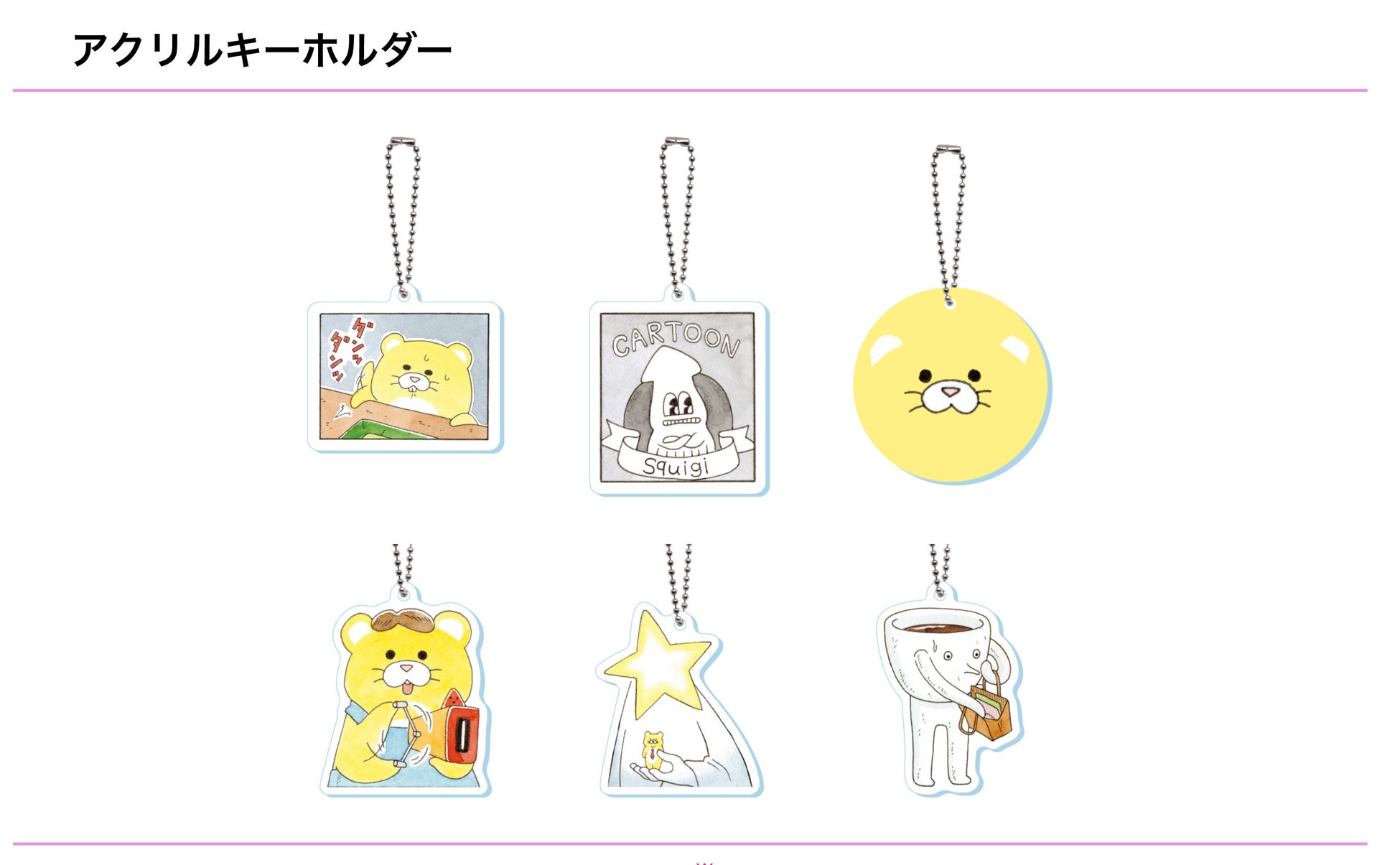 アクリルキーホルダー、缶ミラー、ハンドタオル、Tシャツ、パーカー、キャンバストート、ポストカードなど、可愛いキャラクターたちがデザインされたグッズの発売を致します。また、今回「アジャラ展」のために特別に描き下ろされた水彩原画4点も発売予定です。