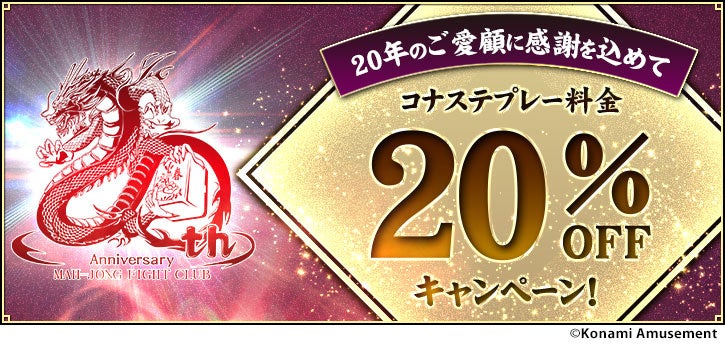 アーケード版と同じ内容、同じデータでご自宅でもプレーできる『麻雀格闘倶楽部 疾風』コナステ版では、20周年を記念し「コナステプレー料金 20%OFFキャンペーン」を開催します。