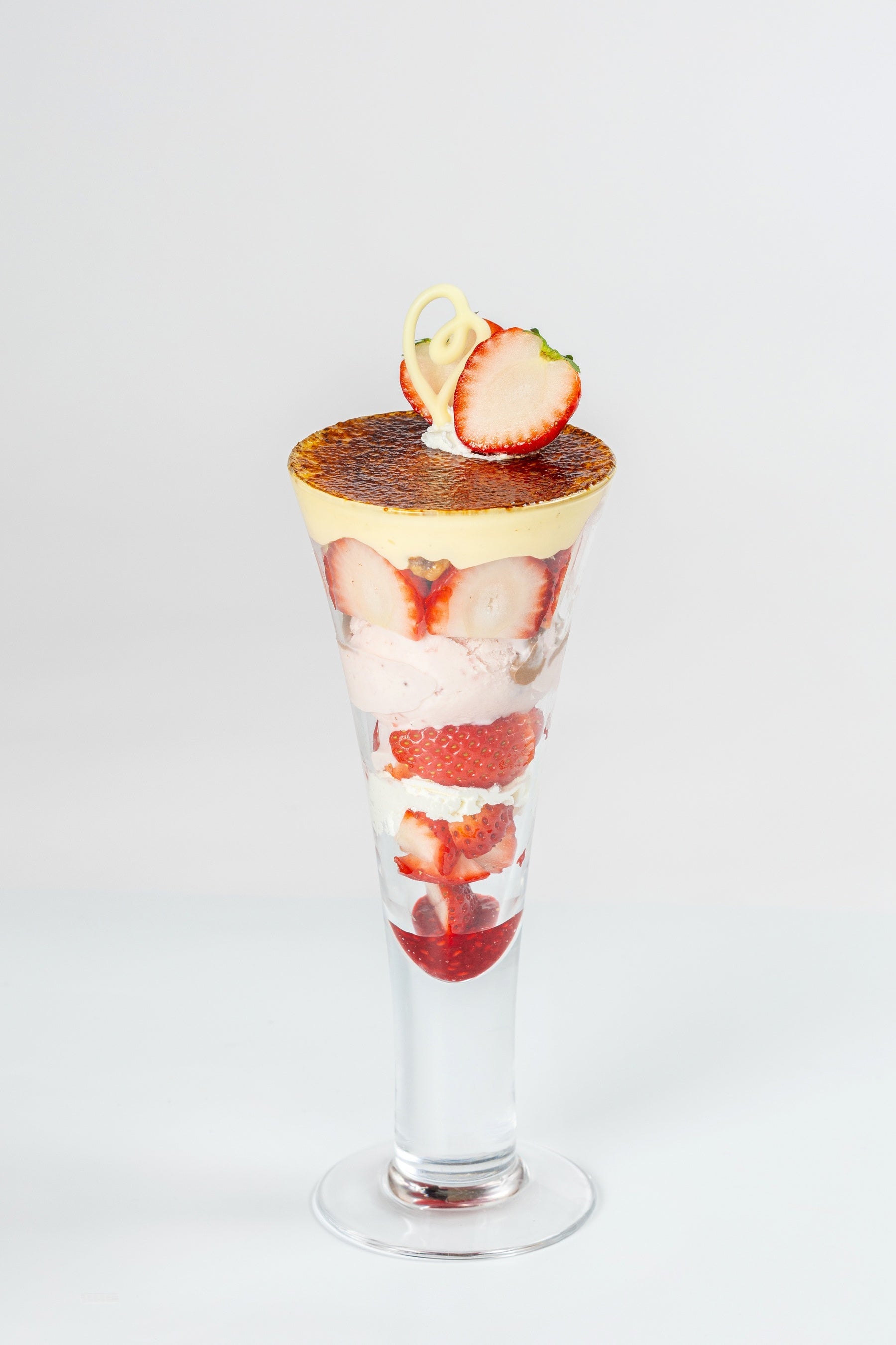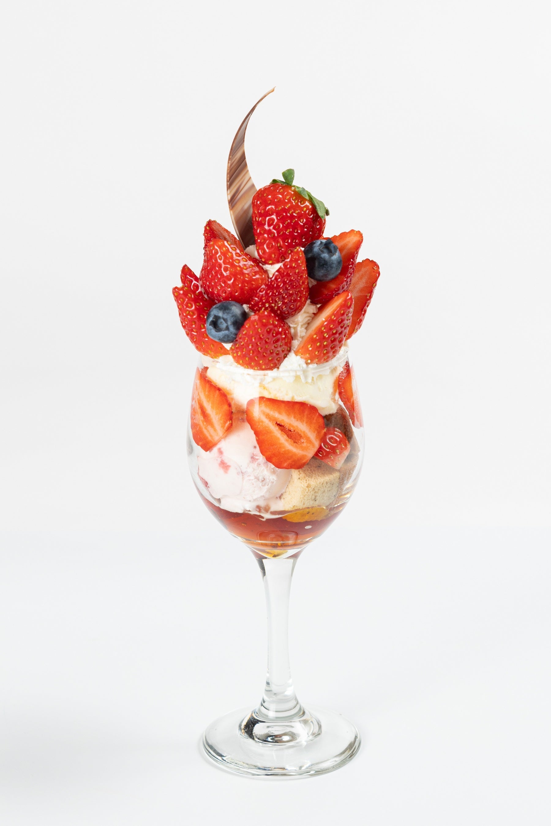 『とちあいかのブリュレパフェ』は、香ばしいクリームブリュレの下に、ハート型の断面が特徴の「とちあいか」やいちごアイス、いちごと相性抜群のチョコアイスなどを詰め込んだパフェです。甘酸っぱいいちごの美味しさを存分にお楽しみいただけます。