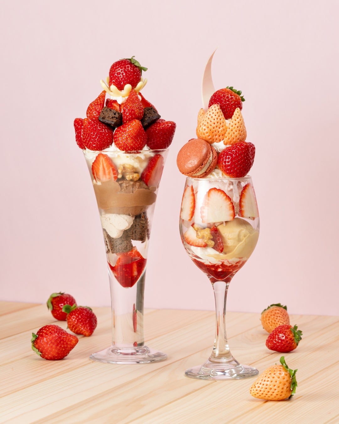 『淡雪&とちあいかベリーロゼパフェ』は、2種のいちごを贅沢に使用したパフェです。酸味が少なく甘みが強いいちご「とちあいか」と、人気の白いちご「淡雪」の味わいの食べ比べが出来るとともに、トッピングされたマカロンや淡雪のピンク色の可愛らしい色合いもお楽しみいただけます。