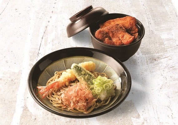 福井駅前に店舗を構える昭和24年創業の老舗そば店。みぞれ状の大根おろしが入った出汁を冷たい蕎麦にかけて食べるのが、福井名物のおろしそば。福井県産と北海道産のソバの実を殻付きのまま石臼で製粉したそば粉を使用した麺、ウルメ節・サバ節・メジカ節をたっぷり使った出汁、ともに自家製です。今回のセットには、エビと野菜の天ぷら付き。福井のソウルフードソースカツ丼とのセットです。