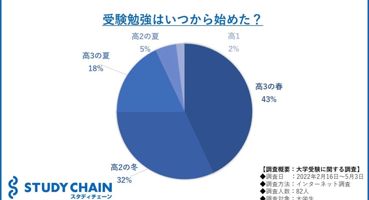 大学受験コーチング『スタディチェーン』( https://studychain.jp/ )の公式ブログ「スタディチェーン ブログ」編集部は、大学生を対象に受験勉強はいつから始めたか調査を行いました。