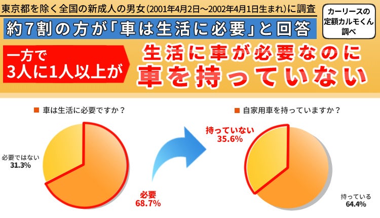 定額カーリース「おトクにマイカー 定額カルモくん」を運営するナイル株式会社(本社:東京都品川区、代表取締役社長:高橋 飛翔)は、東京都を除く全国の2022年新成人(2001年4月2日~2002年4月1日生まれ)に、生活に車が必要かなどについてインターネット調査を実施しましたので、結果をお知らせいたします。