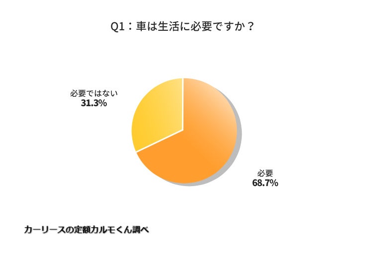 - 調査内容: Q1:車は生活に必要ですか?/Q2:(Q1で「車は生活に必要」と回答した方)自家用車を持っていますか?/Q3:(Q2で「自家用車を持っていない」と回答した方)車が必要なのになぜ持っていないのですか?/Q4:(Q2で「自家用車を持っている」と回答した方)理想の車に乗れていますか?/Q5:(Q2で「持っている」と回答した方)理想の車の条件は何ですか?/Q6:(Q4で「理想の車に乗れていない」と回答した方)なぜ理想の車に乗れていないのですか?
