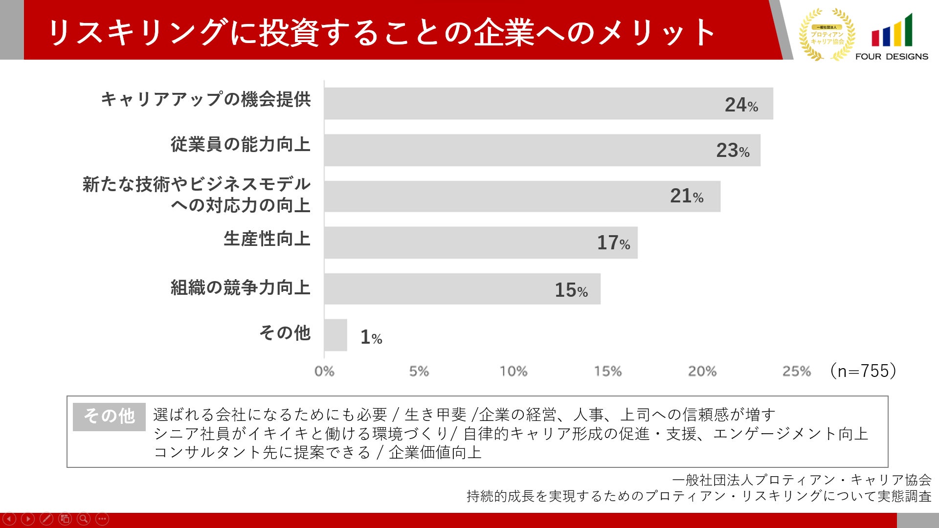 「リスキリングに投資することで、企業にどのようなメリットがあると考えていますか?(複数回答)」(n=755)と質問したところ、「キャリアアップの機会提供」が24%、「従業員の能力向上」が23%、「新たな技術やビジネスモデルへの対応力の向上」が21%、「生産性向上」が17%、「組織の競争力向上」が15%という回答になりました。「キャリアアップの機会提供」を筆頭に従業員のためになるメリットを挙げ、その次に、組織にとってのメリットが挙げられていました。企業が個人のキャリア・能力向上を支援することで、結果として企業も恩恵を受けることができるという、人的資本経営(※)の考えが浮き上がってくる結果となりました。