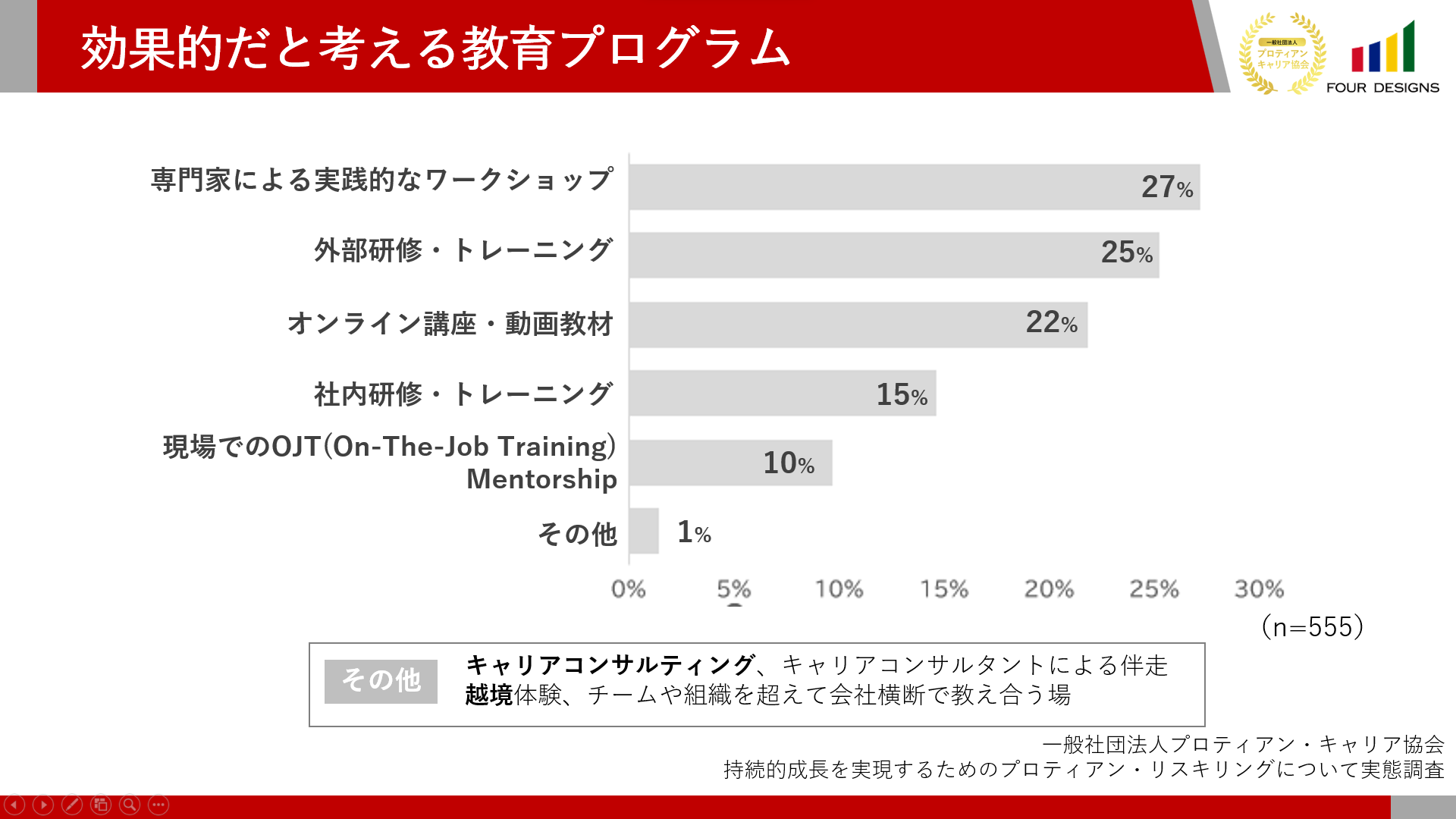 「リスキリングを実施する上で、どのような教育プログラムが効果的だと考えていますか?(複数回答)」(n=555)と質問したところ、「専門家による実践的なワークショップ」が27%、「外部研修・トレーニング」が25%、「オンライン講座・動画教材」が22%、「社内研修・トレーニング」が15%、「現場でのOJT(On-The-Job Training)Mentorship」が10%という回答になりました。上位に挙げらた3点から、リスキリングを実施する教育プログラムとして、「専門家」や「外部講師」の力を活用することと、いつでもどこでも学べる「オンライン」「動画」コンテンツがより効果的であると考られていることがわかります。