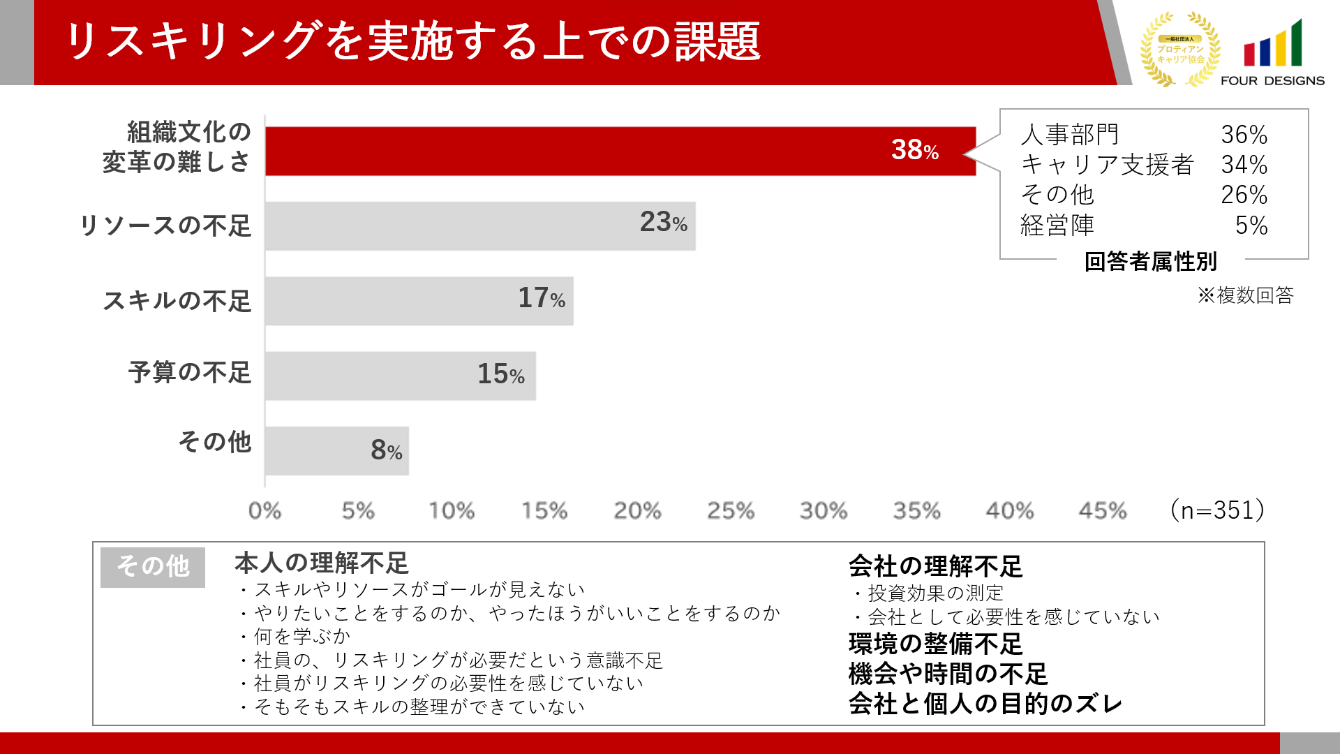 リスキリング導入に関して「組織文化の変革の難しさ」へ課題がある人が約4割
