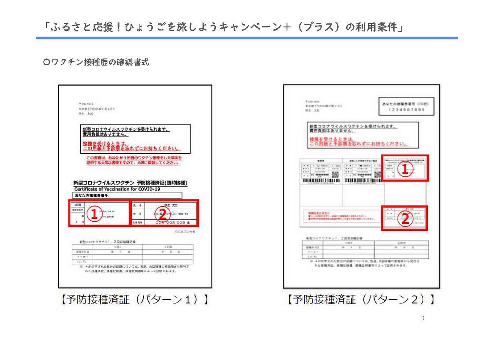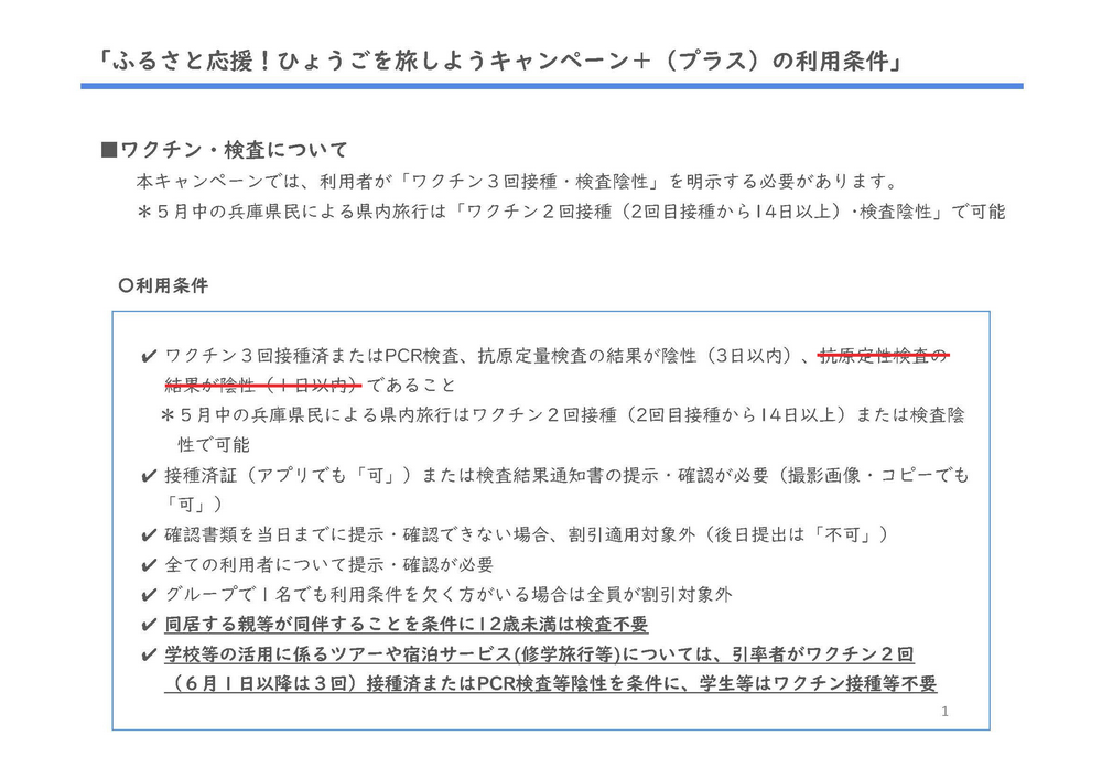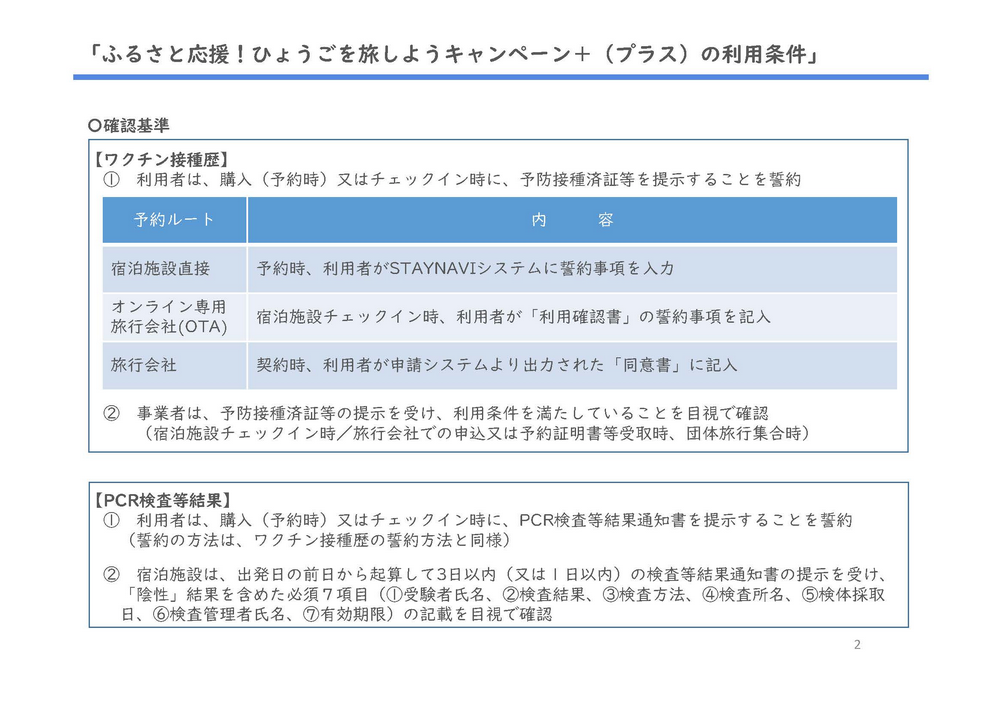 接種済証またはPCR検査等結果通知書(撮影画像、コピー、電子的な証明書でも可)の確認は、同行者も含めて旅行者全員について実施しますので、チェックイン時(旅行会社の場合は予約証明書等お渡しの来店時)にご提示ください。提示のない場合は割引支援を受けることができません。