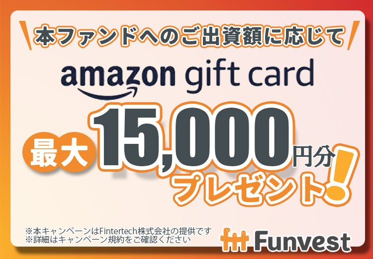 本ファンドへ出資していただいた投資家の皆様を対象として、出資額に応じて最大15,000円分のAmazonギフトカードをプレゼントするキャンペーンも併せて実施いたします。