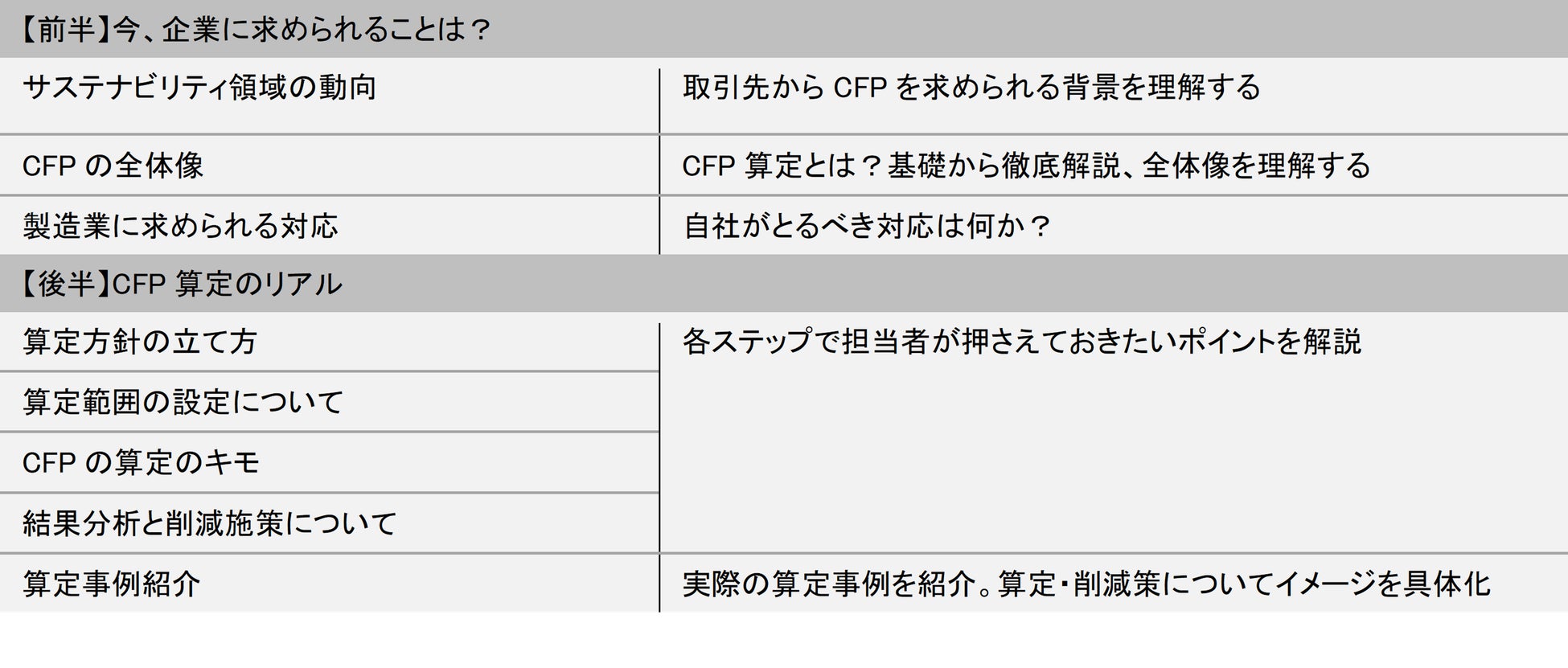 そこで今回、このようなニーズに対応すべく、CFP算定の手順やデータ理解、社内関係者の巻き込み方等を習得し、実践に繋げられる少人数制の講座を開講しました。